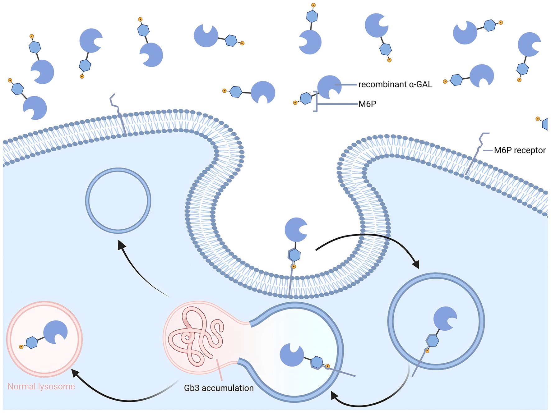 In 2001, ERT was introduced into clinical practice, based on the principle of promoting the degradation of Gb3 and Lyso-Gb3 through intravenous infusion of recombinant α-Gal A (Figure 1). Currently, three ERT drugs have been approved for clinical use worldwide: agalsidase alfa (Replagal®; Takeda), agalsidase beta (Fabrazyme®; Sanofi), and pegunigalsidase alfa (Elfabrio®; Chiesi) (28, 29).
