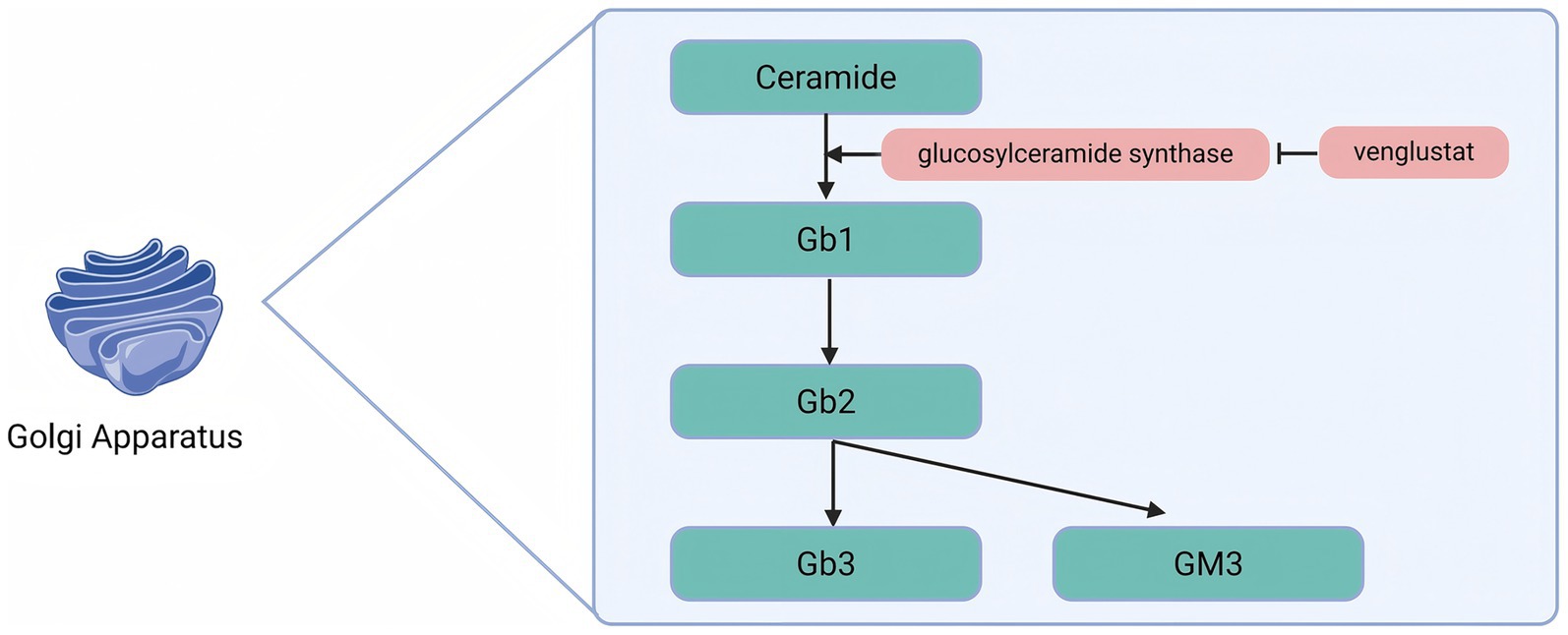 Venglustat is an oral glucose ceramide synthase (GCS) inhibitor that acts by inhibiting the enzymatic conversion of ceramides to glucosylceramides, thereby reducing the available substrates for the synthesis of more complex glycosphingolipids (Figure 3).