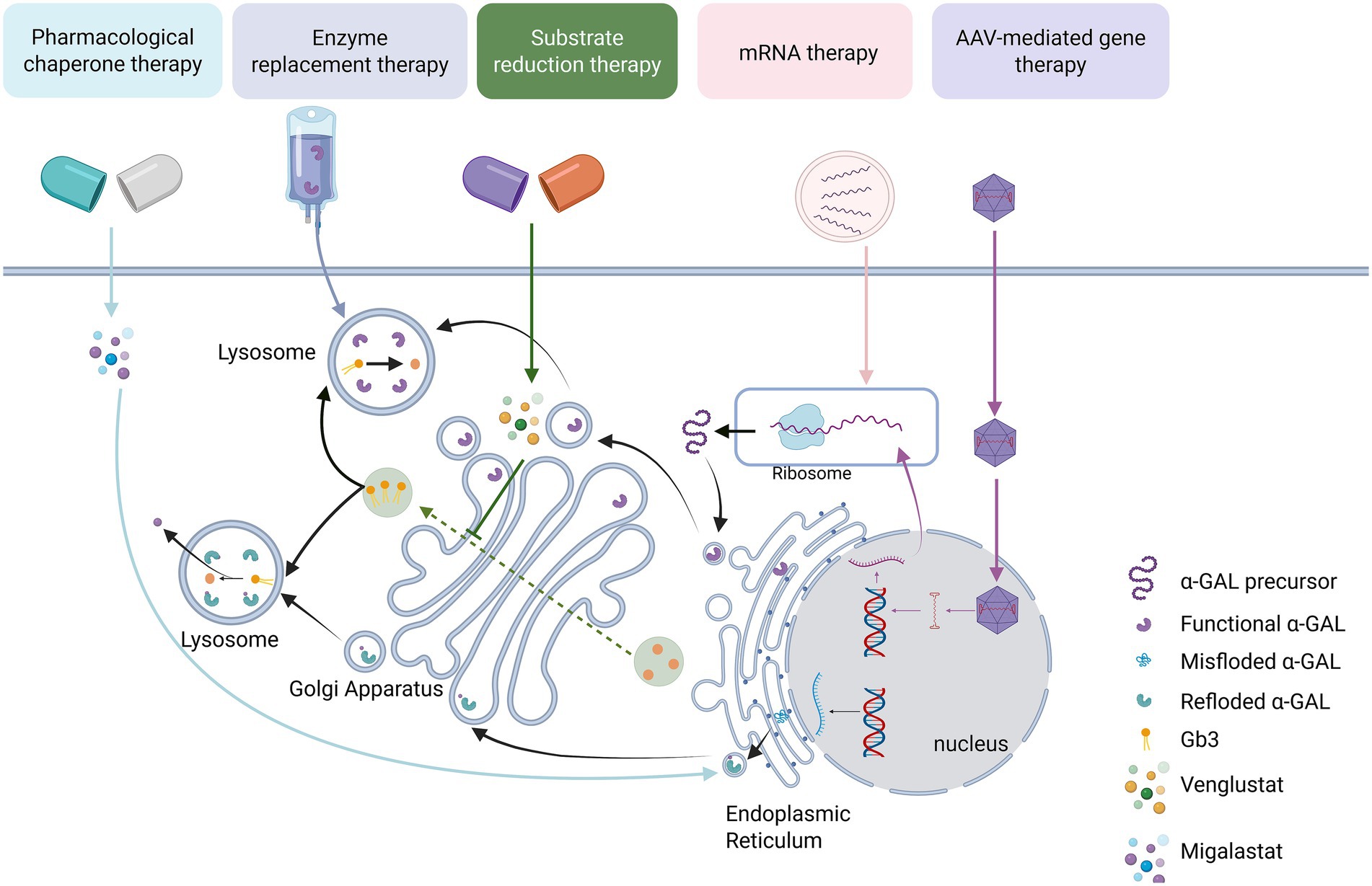 Keywords: Fabry disease, enzyme replacement therapy, pharmacological chaperone therapy, substrate reduction therapy, mRNA therapy, AAV-mediated gene therapy