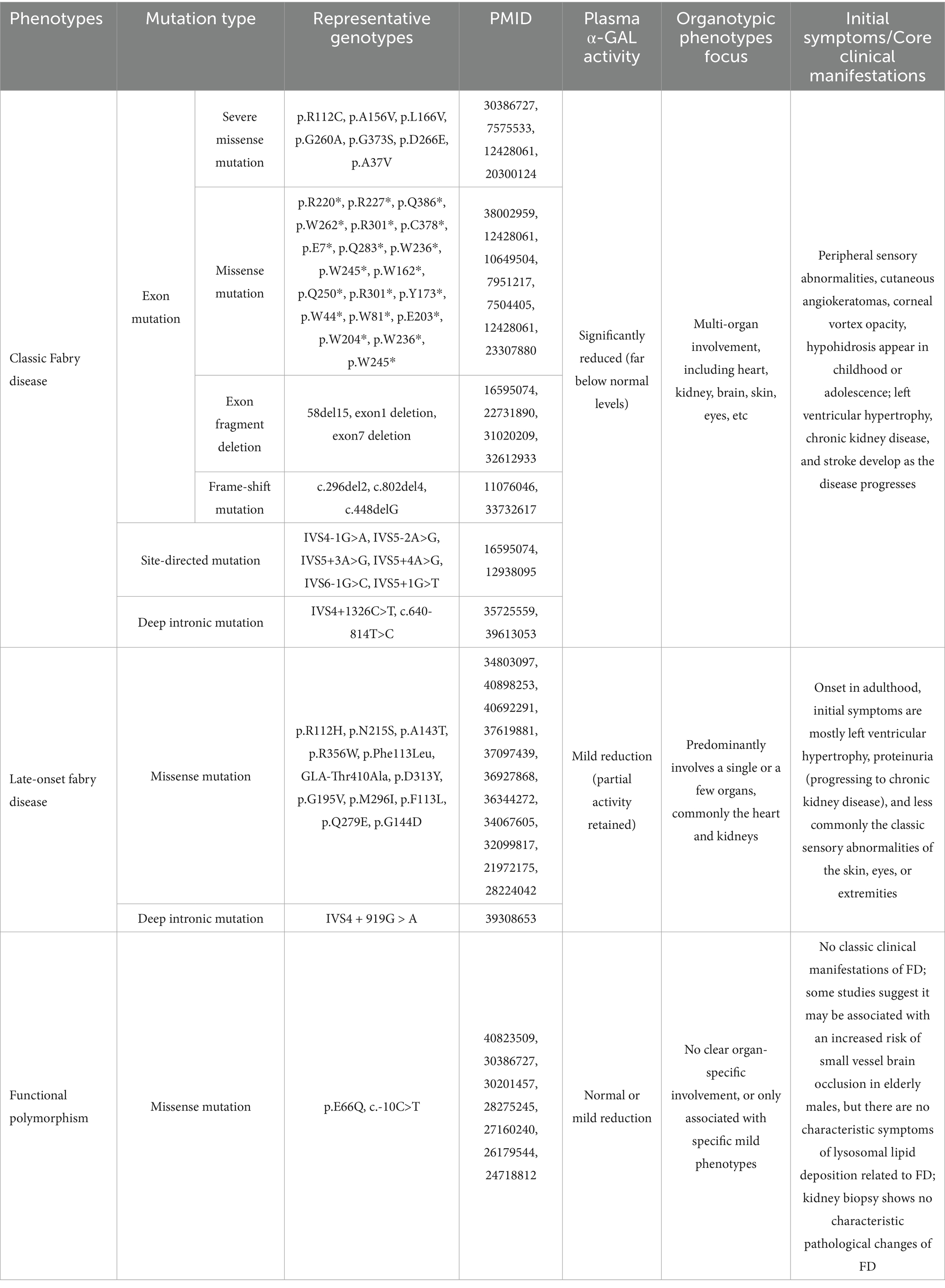 Fabry disease (FD) is a rare X-linked lysosomal storage disorder (LSD) with an estimated birth prevalence of 1 in 6,264 based on a large-scale Chinese newborn-screening cohort (1). FD is caused by pathogenic variants in the GLA gene that reduce or absent the activity of the encoded lysosomal enzyme α-galactosidase A (α-Gal A). Consequently, the metabolic substrates globotriaosylceramide (Gb3) and its deacylated derivative globotriaosylsphingosine (lyso-Gb3) accumulate in multiple cell types—including endothelial cells, podocytes, smooth-muscle cells, cardiomyocytes, and neurons (2, 3). Progressive accumulation underlies the multi-systemic pathology of FD. GLA variants encompass missense, nonsense, frameshift, splice-site, and large copy-number alterations. Missense mutations are the most common, and over 1,000 different genotypes have been identified (4). FD can be classified into classic and non-classic/late-onset forms based on clinical presentation, with a clear distinction between the two types in males. The classic form is typically characterized by absent or significantly decreased α-Gal A enzyme activity, with symptoms usually beginning in childhood or adolescence and progressing to renal, cardiac, and central nervous system pathology in adulthood. In contrast, late-onset patients, retaining higher residual enzyme activity, experience milder phenotypes and a delayed disease course (Table 1). Plasma Lyso-Gb3 levels help to differentiate between the classic and late-onset forms of FD, with classic patients typically exhibiting significantly higher Lyso-Gb3 levels than late-onset patients (5). Due to the stochastic and dynamic nature of X-chromosome inactivation (XCI), and mechanisms such as skewed XCI, female patients exhibit marked heterogeneity in disease severity, ranging from asymptomatic to severe classic manifestations (6). Nevertheless, XCI pattern alone fails to predict individual phenotype. In a single-centre, cross-tissue study of 95 female GLA-variant carriers, skewed XCI (≥75:25) was detected in 35% of blood, 33% of skin fibroblast and only 7% of oral epithelial samples. Irrespective of tissue source or XCI pattern (skewed vs. random, mutant-allele-active vs. inactive), no significant association emerged between XCI skewing and clinical severity, organ involvement, leukocyte α-Gal A activity, or plasma Gb3 (p > 0.05). Thus, even in blood—the tissue most prone to skewing—XCI status does not stratify symptom severity (7).