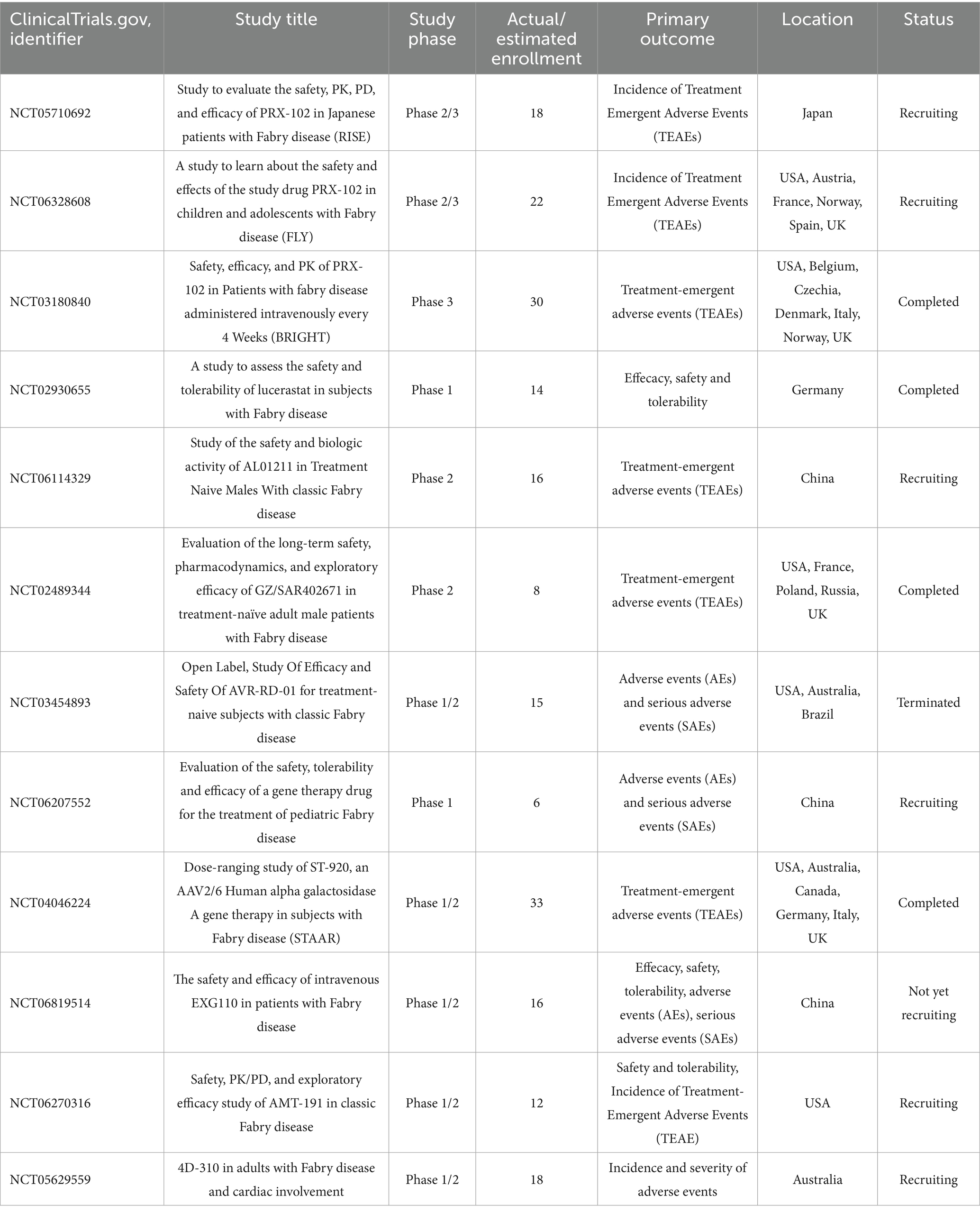 As research deepens and clinical experience accumulates, the clinical presentation spectrum of FD has been greatly expanded. As a disease affecting multiple systems, its manifestations are highly heterogeneous and camouflaged. More and more atypical or easily overlooked symptoms, such as decreased lung function (23), gastrointestinal manifestations (abdominal pain, diarrhea, vomiting) (24, 25), and azoospermia (26, 27), have been identified, sometimes even as the initial or only symptom, greatly challenging traditional diagnostic approaches. Since ERT was introduced into clinical treatment, emerging therapies that are continuously iterated are gradually reshaping its treatment landscape. From the initial ERT “alternative therapy” aimed at supplementing exogenous α-Gal A, to the “functional repair therapies” represented by small-molecule pharmacological chaperones and substrate reduction therapy, and then to the “root cause correction therapies” centered on gene therapy, mRNA delivery, and gene editing, the treatment philosophy has undergone three generational leaps. Registered clinical studies regarding the emerging therapies of FD are summarized in Table 2.