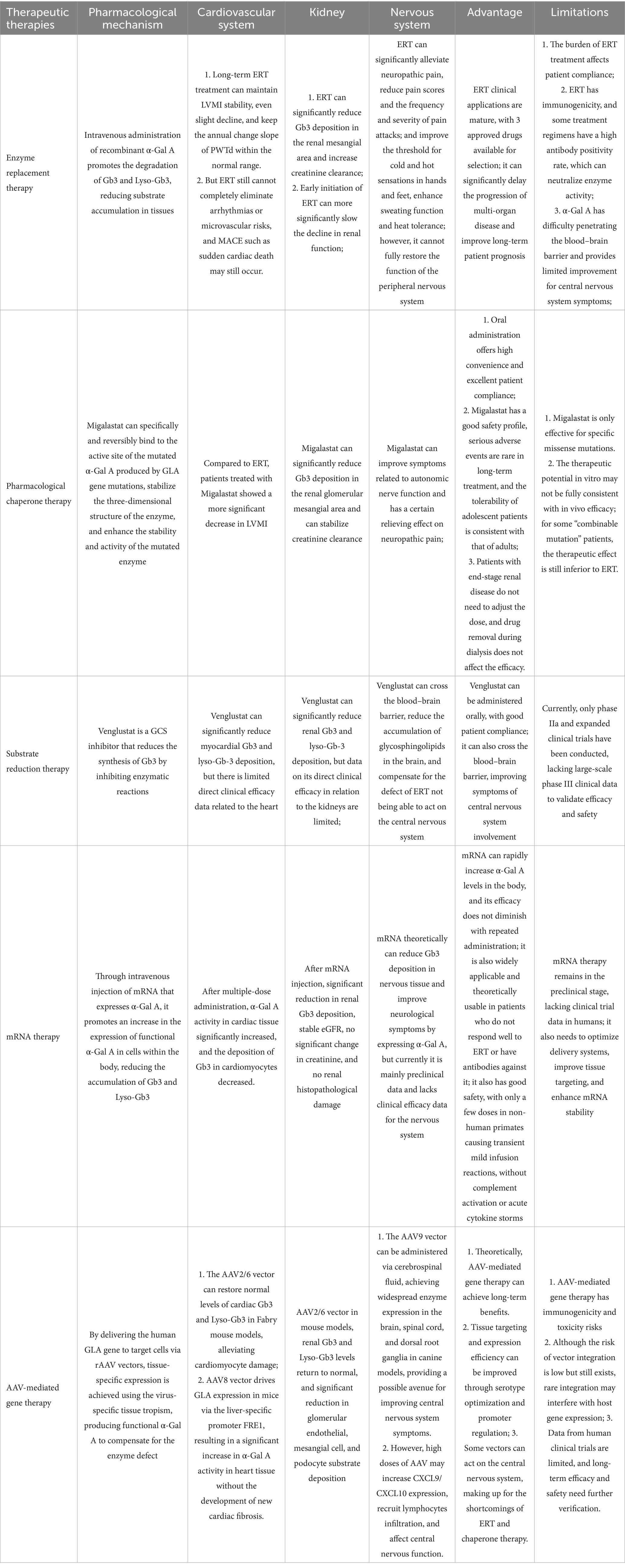 Table 3. Comparison of the pharmacological mechanisms, organ benefits, and limitations of the main treatment strategies for Fabry disease.