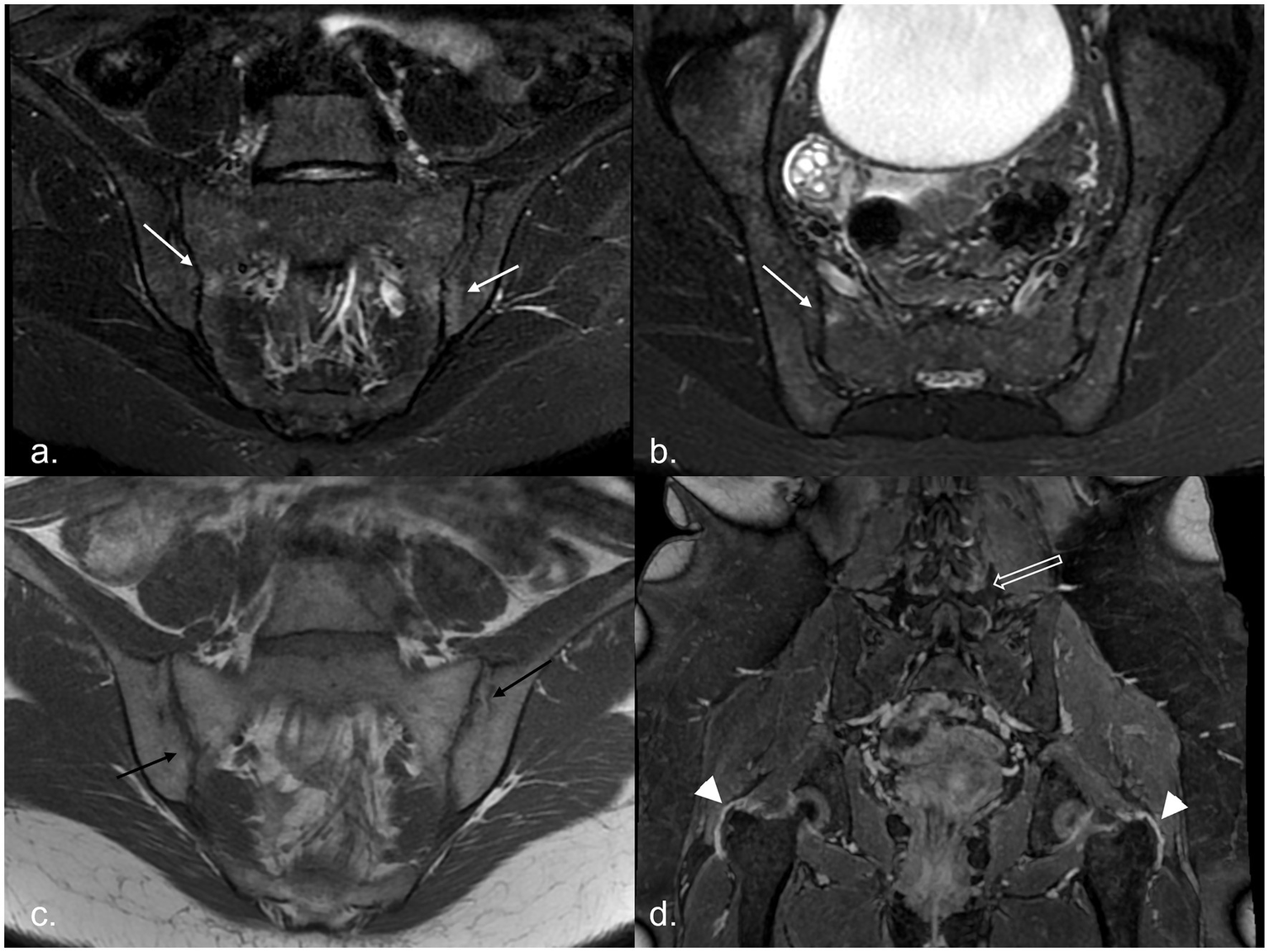 MR examination of a 20-year-old woman with recurrent fever: it shows areas of subchondral BME on the right sacral and left iliac sides of the sacroiliac joints [white arrows, panel (a) in the oblique coronal plane and panel (b) in the oblique axial plane], associated with multiple bilateral joint erosions [black arrows in panel (c)]. After administration of CM, in the 3D panoramic sequence for the hip, trochanteric enthesitis (arrowhead) and facet capsulitis (empty white arrow) are evident [panel (d)]. BME, bone marrow edema; CM, contrast media.