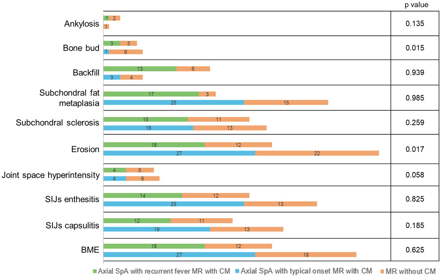 | MR findings | Axial SpA with recurrent fever | Typical onset Axial SpA without recurrent fever | p |