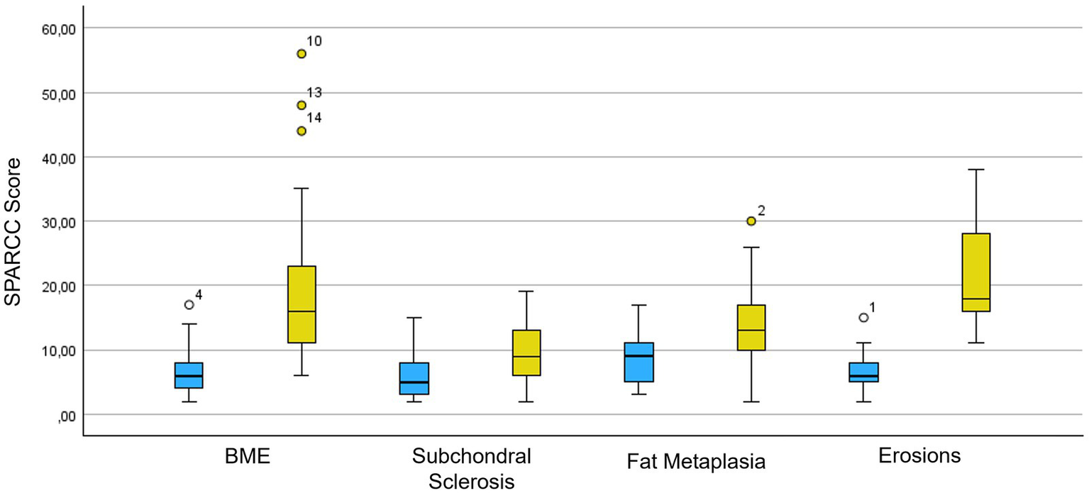 SPARCC score box plot for acute and chronic inflammatory MR changes of the SIJs. In blue is the population of axial SpA patients with recurrent fever syndromes and in yellow is the population of axial SpA patients with typical presentation. SPARCC, SPondyloArthritis Research Consortium of Canada; BME, bone marrow edema.