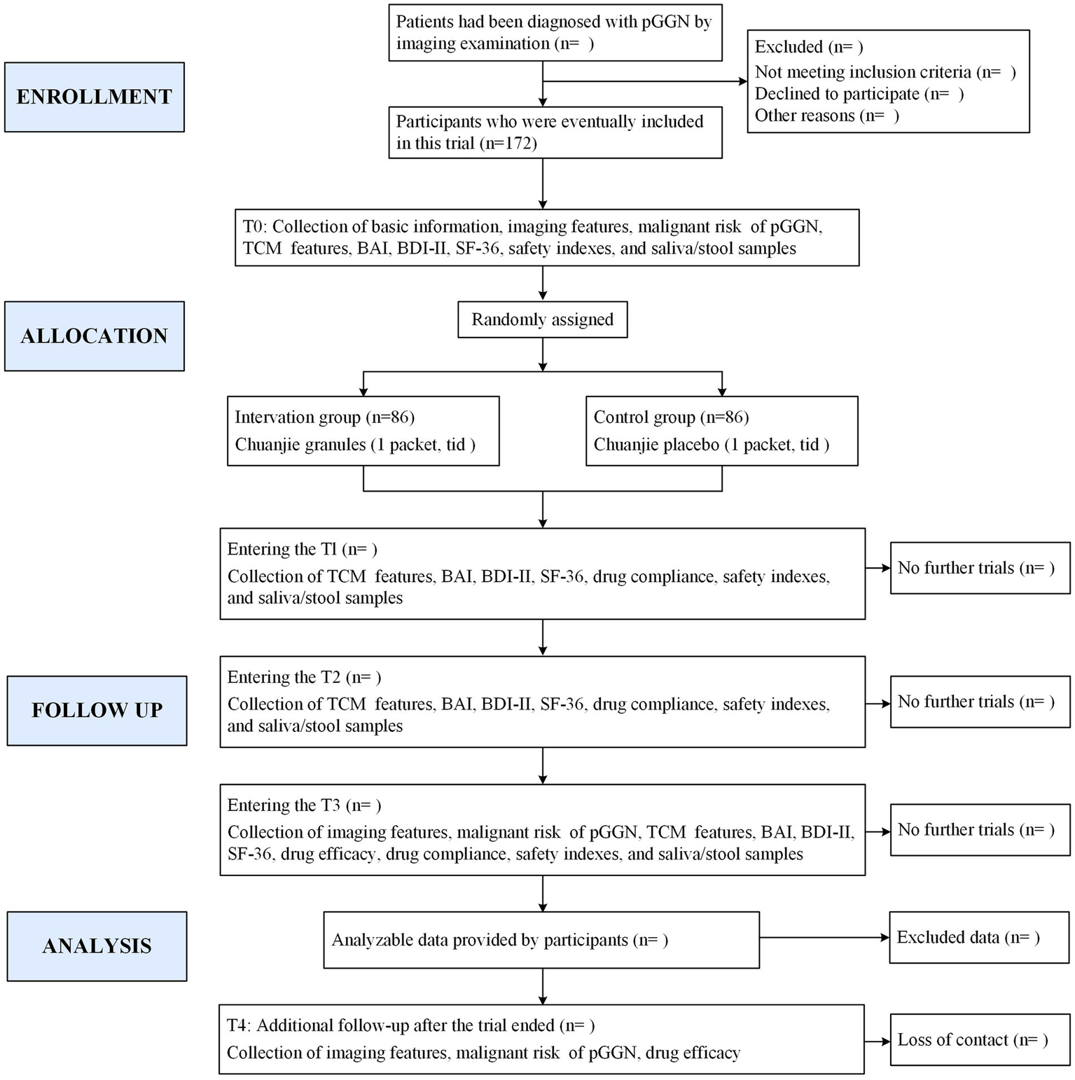 This triple-blind, multicenter, randomized, placebo-controlled trial is crucial for exploring TCM as a complementary treatment for pGGNs. Beyond the primary radiological endpoint, the study also assesses secondary outcomes, including anxiety (measured by BAI), depression (assessed using BDI-II), and quality of life (evaluated through SF-36), to comprehensively capture the holistic benefits of TCM. Additionally, the trial explores potential mechanisms underlying these effects through 16S rRNA gene sequencing and metabolomic analysis of saliva and stool samples. These extensive assessments are underpinned by the study’s rigorous methodology, which incorporates randomization to mitigate confounding factors, stringent triple-blinding to reduce bias, and a multicenter design to enhance the reliability and generalizability of the findings. While the Traditional Chinese Medicine (TCM) intervention is confined to a duration of 3 months—selected based on preliminary data and practical considerations—participants’ nodule status is monitored for more than a year to assess potential long-term effects. However, this short intervention may not fully capture TCM’s benefits, which usually appear over longer periods. Future research should explore extended treatment durations to better evaluate lasting effects. Other limitations include reliance on CT scanner performance, resolution, and subjective interpretations by radiologists, which may lead to variability in feature descriptions and reporting standards. Additionally, this study was conducted in Sichuan Province, China, and while the sample size was adequate for primary outcomes, it may not represent global genetic, lifestyle, and environmental diversity. TCM practices can vary by region, and although CJG is standardized, its effects might be influenced by local diets or constitutions. Thus, our findings may not be generalizable to other populations. Future multicenter trials with diverse ethnic and geographical backgrounds are needed to validate the universal applicability of CJG.