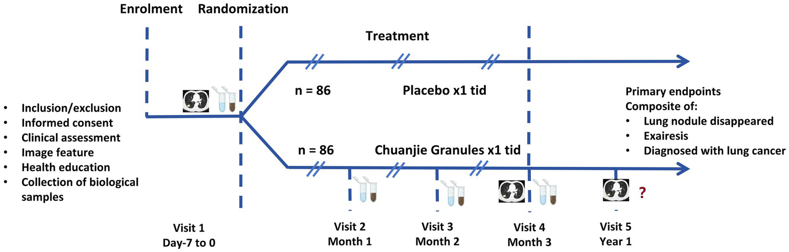 Traditional Chinese Medicine (TCM) presents potential clinical benefits for the “preventive treatment” (zhi wei bing) of pulmonary nodules and early-stage lung cancer. The prolonged surveillance period during follow-up observation provides an ideal opportunity for TCM intervention, which may contribute to the reduction of nodule volume, prevention of malignant transformation, and alleviation of clinical symptoms (11–13). Chuanjie Granules (CJG), a TCM compound granule formulation developed by our research team, is based on extensive clinical experience in the treatment of pulmonary nodules. This formulation consists of seven herbal components: Vaccaria segetalis, Platycodon grandiflorus, Achyranthes bidentata, Citrus aurantium, Trichosanthes kirilowii, Curcuma longa, and Pumex. The formulation has been submitted for a Chinese invention patent (application no. 202510241770.3). An initial investigation involving 91 patients indicated that CJG significantly decreased nodule size, with a total effective rate of 52.2% (p < 0.05) specifically concerning the reduction in diameter of pGGNs (14). Moreover, CJG was well-tolerated and proved effective in enhancing patient quality of life while mitigating symptoms of anxiety and depression. Nonetheless, the study’s findings were constrained by its single-center design, limited sample size, and absence of a placebo control.