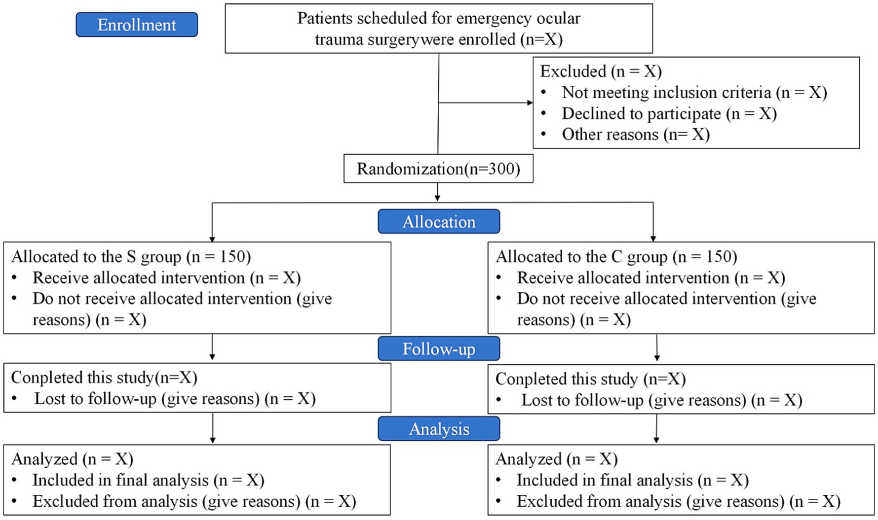 According to the literature, the incidence of PTSD at 1 month after trauma surgery is approximately 23.2% (21). Previous epidemiological studies have reported rates up to 30–33% in patients with ocular trauma, substantially higher than in the general trauma population (9, 11). Based on these data and our small pilot observation, we set the expected PTSD incidence in the control group at 26%. We therefore adopted 26% as a conservative estimate to guide the sample size calculation. This conservative approach ensures that statistical power will not be underestimated if the true incidence in our study population is somewhat lower than that reported in epidemiological studies, while still remaining consistent with the published range. We hypothesize that SGB will reduce the risk of postoperative PTSD by 50% in patients undergoing emergency ocular trauma procedures. Using a two-sided test with a significance level of α = 0.05 and 80% power, a minimum of 142 participants per group is required. Accounting for an anticipated 10% dropout rate, the final target sample size is 300 patients, with 150 allocated to each group.