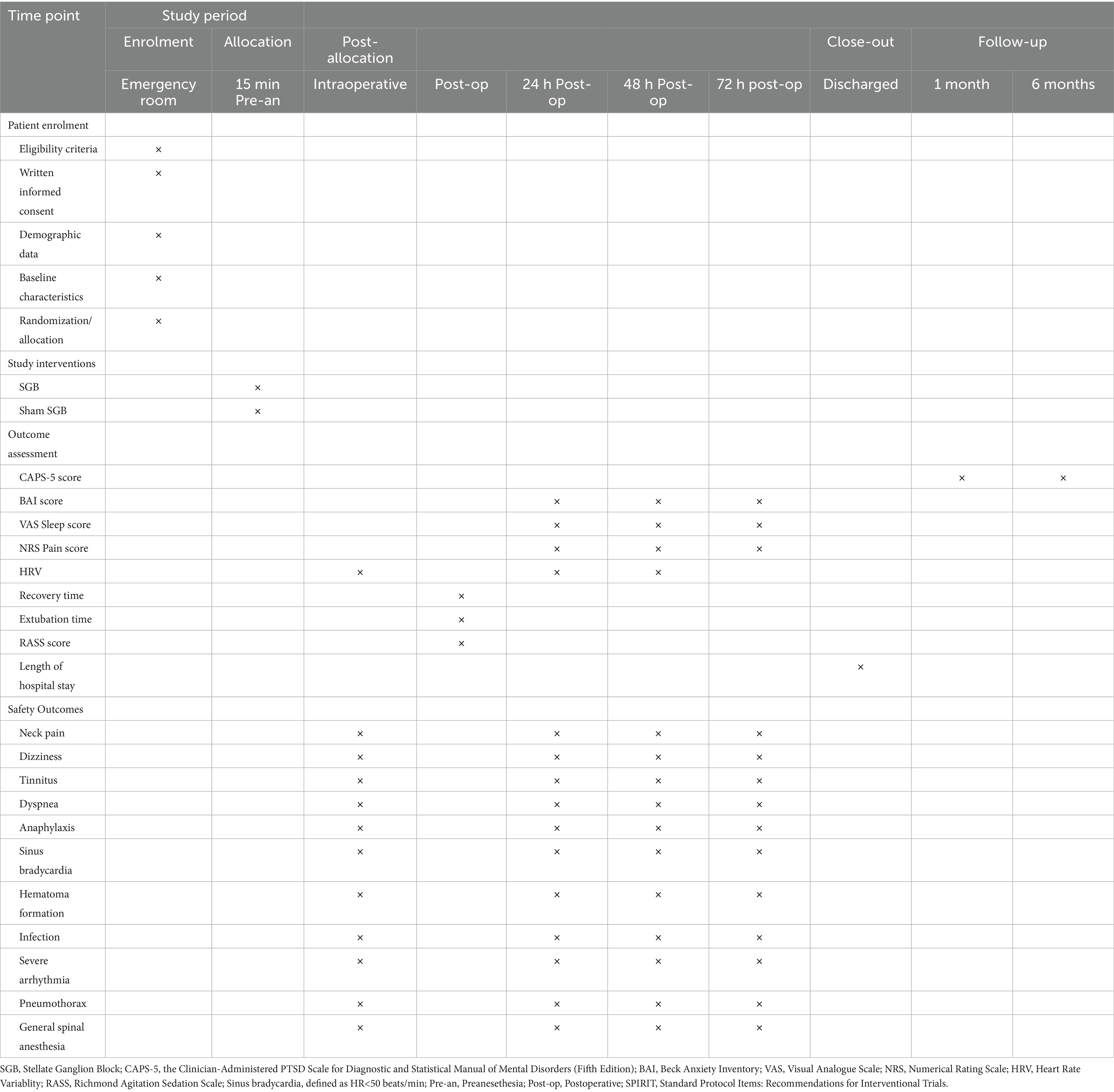 An independent research staff member will generate the randomization sequence using the Sealed Envelope online tool,1 with a 1:1 allocation ratio, permuted blocks of 2 and 4, and stratification by age (18–64 and ≥65 years). The allocation results will be stored in sequentially numbered, sealed opaque envelopes. Patients will be randomly assigned to either the SGB group or the control group (n = 150 per arm). The anesthesiologists responsible for administering the intervention will be aware of group allocation due to the nature of the procedure but will not be involved in patient recruitment, data collection, or outcome assessment. Patients, surgeons, postoperative care providers, outcome assessors, and the data analyst will remain blinded to group assignments throughout the study. Successful stellate ganglion block in the intervention group will be confirmed by the occurrence of Horner’s syndrome (ptosis, miosis, enophthalmos, conjunctival hyperemia, and facial anhidrosis). Patients will not be informed whether these clinical signs occur, thereby maintaining the integrity of blinding. The schedule for patient enrollment, study interventions, and outcome assessments will adhere to the SPIRIT statement (Table 1).