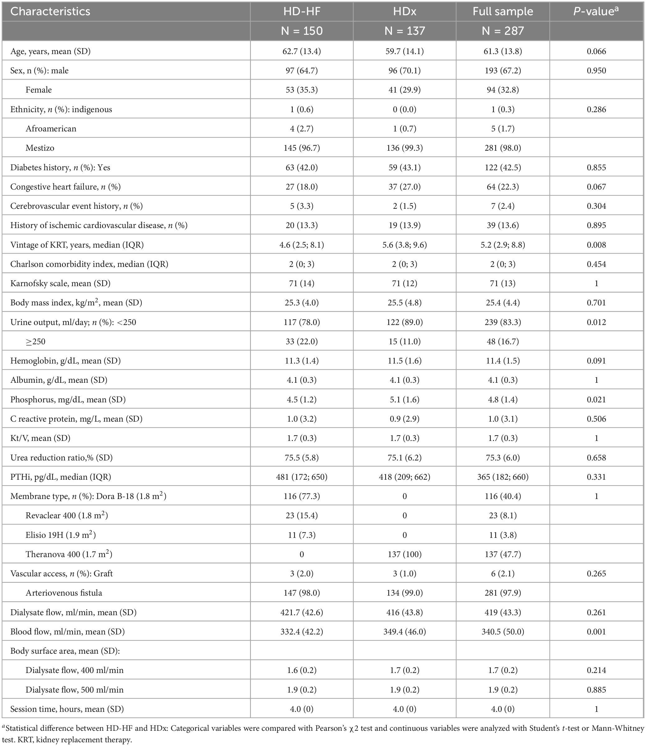 A total of 287 patients were eligible, 137 of whom were in the HDx group and 150 in the HF-HD group. After 12 weeks of study follow-up, 97.3% of participants in the HF-HD cohort and 94.2% in the HDx cohort completed follow-up. The main reasons for censoring were dialyzer change (1.4%) and death (1.1%). See Figure 1. At baseline, the mean age was 61.3 years, 67% were men, and the leading causes of CKD were diabetic kidney disease (42.5%), followed by hypertension and glomerular/autoimmune diseases. 22.3% of the patients had a diagnosis of congestive heart failure, and 13.6% had a history of ischemic cardiovascular disease.