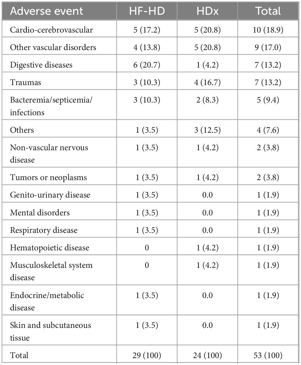 In terms of safety, a total of 53 adverse events were recorded during the follow-up period. The most frequent causes were cardiovascular disease (18.9%), cerebrovascular disease (17%), gastrointestinal disease (13.2%), and trauma (13.2%). Details are presented in Table 4. Regarding serious adverse events, we observed that the HDx group had a 50% lower frequency compared to the HF-HD group (75.9%). This difference was statistically significant (p = 0.048). Additionally, we found that the HDx group had a lower hospitalization rate (6.6%) than the HF-HD group (13.3%). This difference was also statistically significant (p = 0.028). Of the total serious and non-serious adverse events, none were causally related to the use of any type of dialyzer.