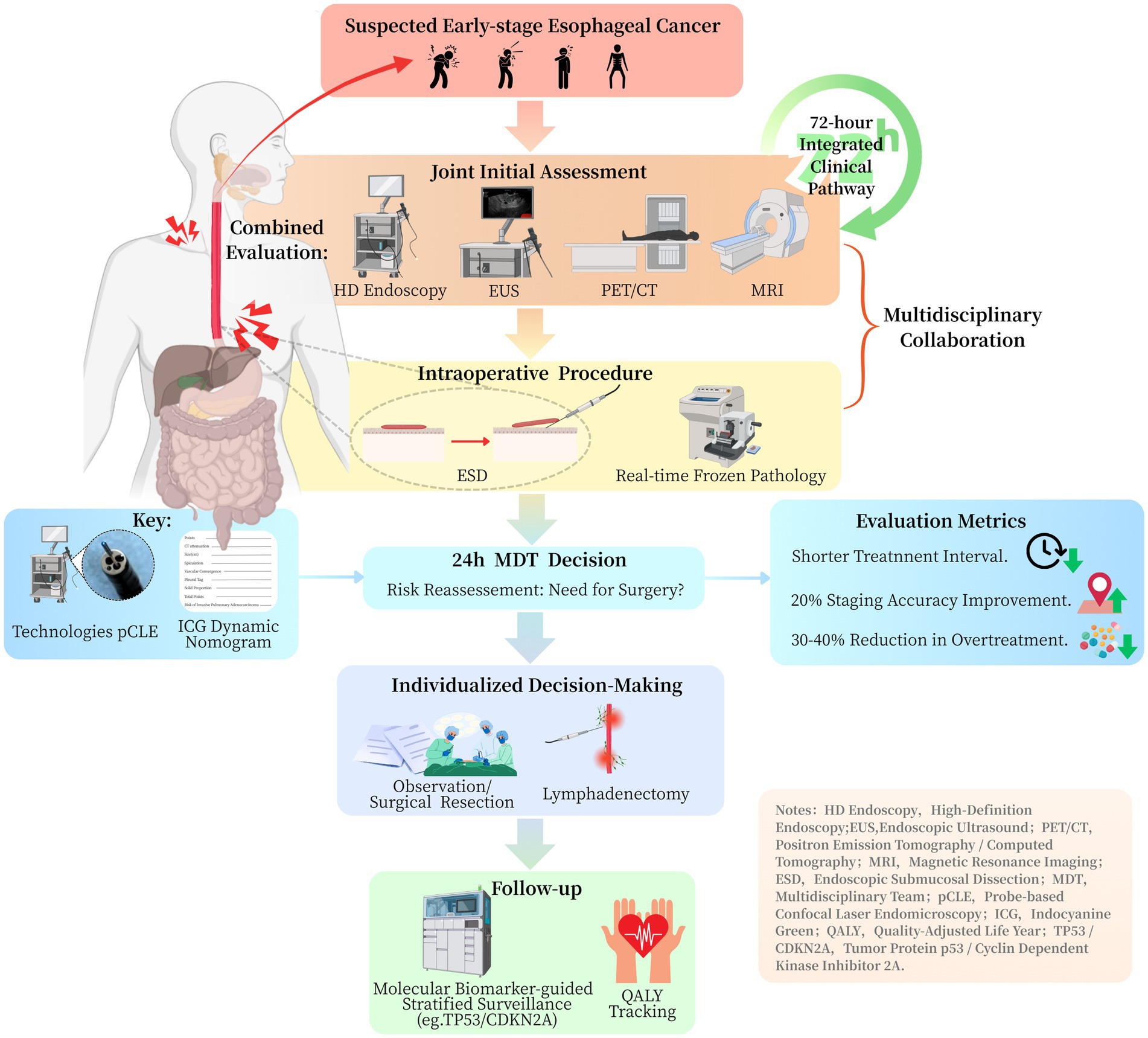 The management of early-stage esophageal cancer remains suboptimal due to fragmented coordination between endoscopic and surgical modalities, resulting in diagnostic delays and inconsistent therapeutic decision-making. This study presents an integrated clinical framework that synergizes advanced endoscopic techniques (endoscopic submucosal dissection, endoscopic mucosal resection) with thoracic surgical interventions, supported by multimodal staging protocols to improve diagnostic accuracy by approximately 20%. A key innovation is the implementation of a streamlined 72-h clinical pathway, which reduces treatment delays through real-time multidisciplinary collaboration and intraoperative risk stratification using machine learning-based predictive models. To address systemic barriers, the framework incorporates competency-based cross-disciplinary training programs and value-based reimbursement structures, targeting a 28.7% reduction in treatment discrepancies. Future advancements focus on molecular stratification and health economic evaluations to further refine precision oncology approaches. This paradigm shift from sequential to integrated care demonstrates potential to enhance both oncologic outcomes and healthcare resource utilization in early esophageal cancer management.