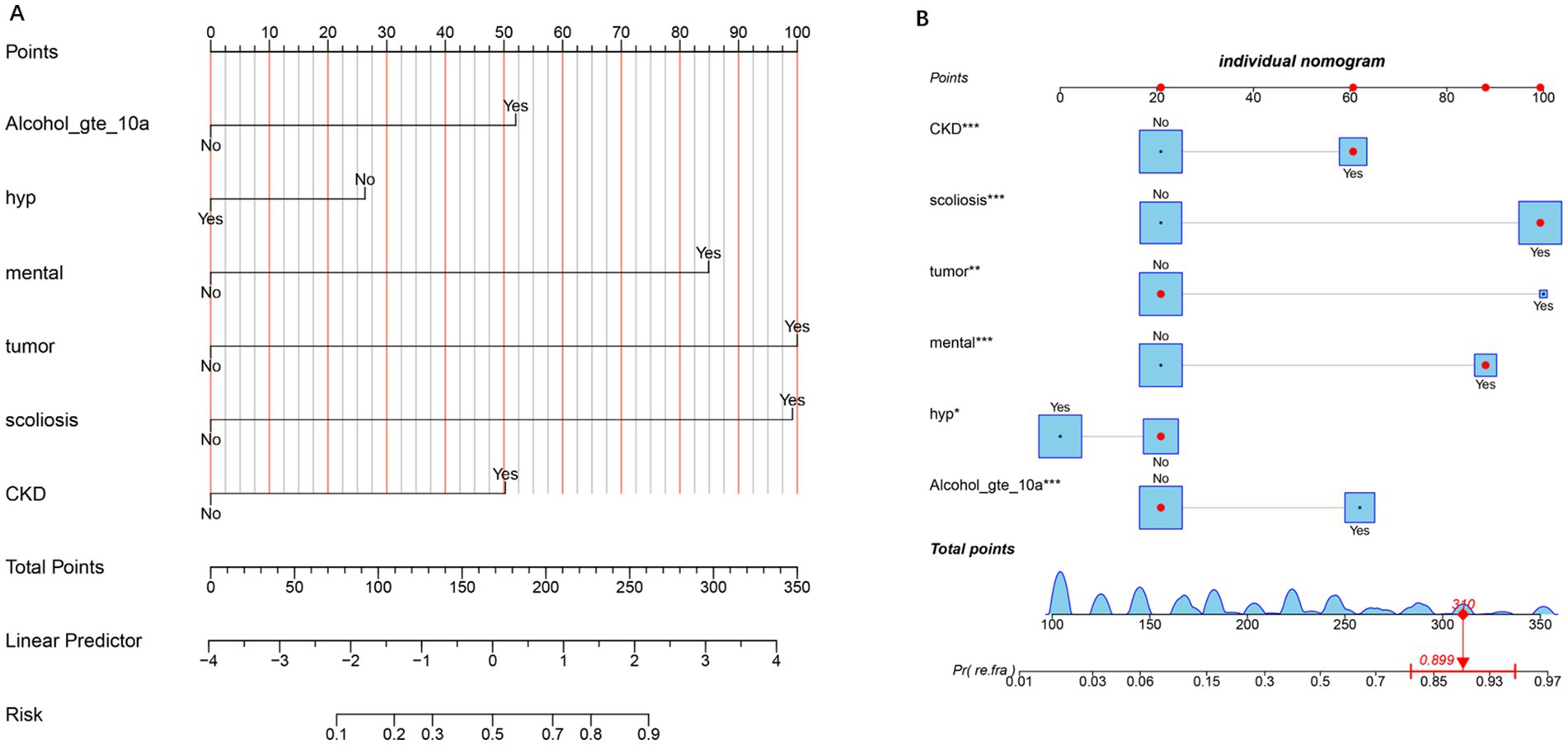 Figure 1. Nomogram for predicting the risk of refracture. (A) The nomogram illustrates the contribution of each predictor (e.g., Alcohol_gte_10a, hypertension, mental health, tumor, scoliosis, and CKD) to the total points, which are then mapped to the linear predictor and the corresponding risk probability. The “No” and “Yes” options for each predictor indicate the absence or presence of the condition, respectively. Higher total points correlate with an increased risk of the outcome. (B) Individual nomogram displaying the detailed point allocation for each predictor, with asterisks denoting the statistical significance of variables (*p < 0.05, **p < 0.01, and ***p < 0.001). The bottom axis shows the total points, which are converted to the predicted probability of the refracture, with an example calculation (310 points ≈89.9% risk).