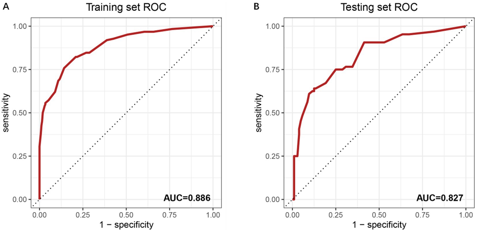 Figure 2. ROC curves for model performance evaluation. (A) ROC curve of the training set with an AUC of 0.886. The x-axis represents the false positive rate (1-specificity), and the y-axis denotes the true positive rate (sensitivity). The diagonal dashed line indicates a reference performance (AUC = 0.5). Numerical labels (0.00, 0.25, 0.50, 0.75, 1) correspond to key thresholds for specificity and sensitivity. (B) ROC curve of the independent testing set, showing an AUC of 0.827. The reduced AUC compared to the training set suggests the model’s generalizability. Threshold values (0.00, 0.25, 0.50, 0.75, 1) align with standard ROC interpretation.