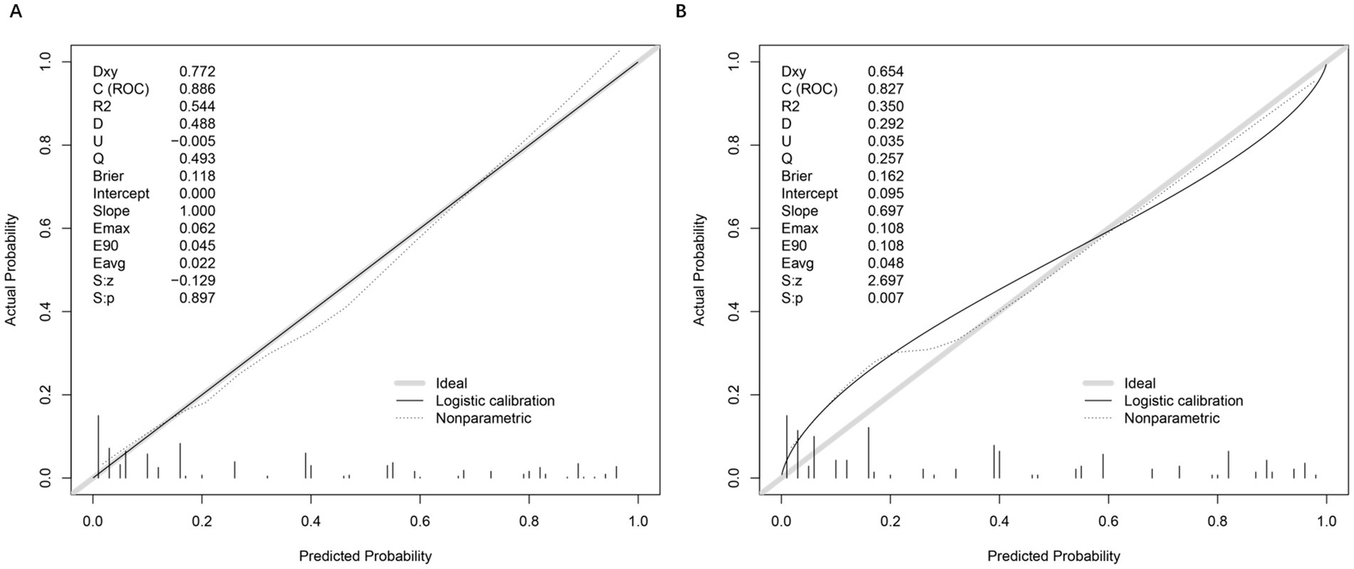 Figure 3. Calibration plots and performance metrics for model validation. (A) Calibration plot of the training set, comparing actual versus predicted probabilities. Key metrics include Somers’ Dxy (0.772), C-index (ROC = 0.886), R2 (0.544), and Brier score (0.118). The logistic calibration curve (solid line) and nonparametric ideal line (dashed) demonstrate model fit. Slope (1.000) and intercept (0.000) indicate minimal calibration drift. Additional metrics (Emax = 0.062, E90 = 0.045, Eavg = 0.022) reflect small calibration errors. (B) Moderate agreement between predicted and observed OVCF re.fra probabilities, with a calibration slope of 0.697 (ideal = 1.000), Brier score of 0.162, and integrated calibration index (Eavg = 0.048), reflecting an average 4.8% deviation between predictions and outcomes. While the model retained clinical utility (Brier <0.2), significant slope deviation (0.697 vs. 1.0) and intercept shift (0.095) indicated overfitting and systematic overestimation in high-risk subgroups (predicted probabilities >0.3), as evidenced by nonparametric calibration divergence and elevated errors (Emax = E90 = 0.108, Eavg = 0.048). The Spiegelhalter test (S: p = 0.007) and reduced discrimination metrics (Dxy = 0.654, C-index = 0.827, R2 = 0.350) further underscored the need for recalibration to improve accuracy in high-risk populations. These deviations primarily occur in two regions: (1) For predicted probabilities <0.3, the model shows slight overestimation of risk (observed events were ~10% lower than predicted), likely due to fewer low-risk cases in our cohort; (2) At higher predicted probabilities (0.7–0.9), we observe modest underestimation, where actual event rates exceeded predictions by ~8%.
