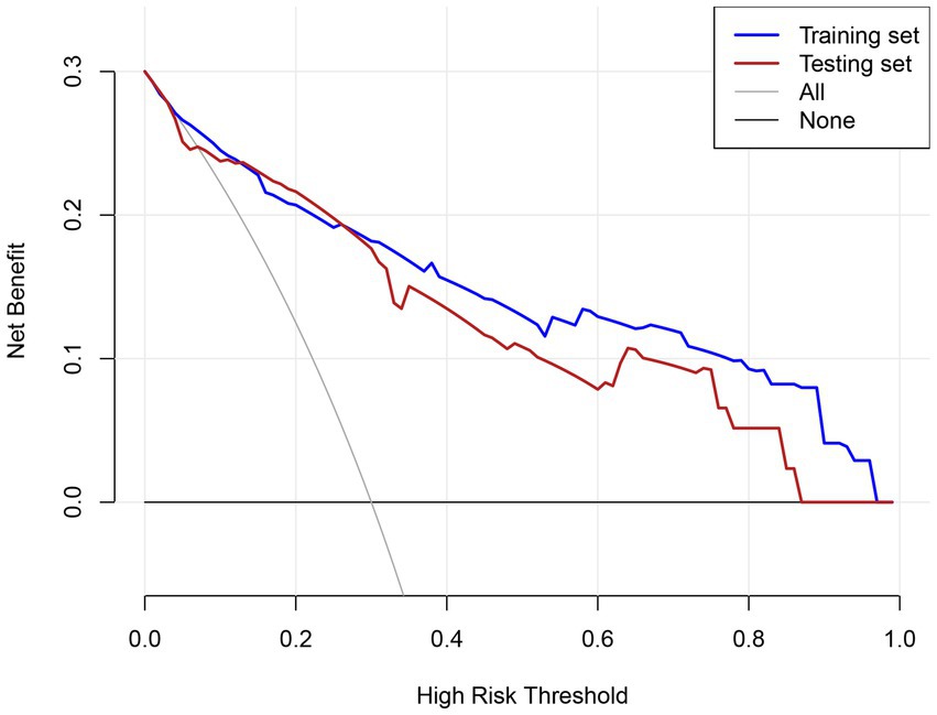 The model demonstrated strong discriminative ability in both cohorts, with an area under the curve (AUC) of 0.886 (95% CI: 0.850–0.922) in the training cohort and 0.827 (95% CI: 0.762–0.893) in the validation cohort. Further evaluation through decision curve analysis, plotting net benefit for the training set (solid line), testing set (dashed line), and reference strategies (“All” and “None”), revealed superior clinical utility across the 0.1–1.0 risk threshold range. This confirms its potential for guiding clinical decisions within clinically relevant probability thresholds.