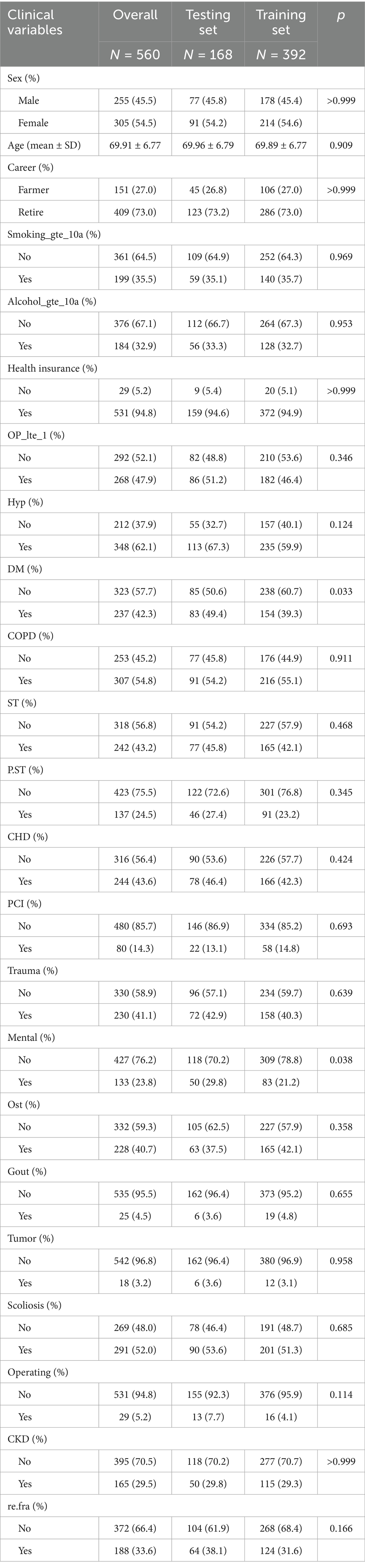 The study cohort comprised 560 patients with OVCF, divided into a training set (n = 392, 70%) and a testing set (n = 168, 30%). Baseline characteristics were well-balanced between the two sets, with no significant differences in most demographic and clinical variables (all p > 0.05, Table 1). The mean age of the cohort was 69.91 ± 6.77 years, with a slightly higher proportion of females (54.5%) compared to males (45.5%). The majority of the patients were retirees (73.0%) and had health insurance coverage (94.8%). Key comorbidities included hypertension (62.1%), DM (42.3%), chronic obstructive pulmonary disease (54.8%), and CKD (29.5%). Notably, the prevalence of OVCF re.fra was consistent across the training (31.6%) and testing sets (38.1%, p = 0.166), ensuring comparable risk profiles for model development and validation. However, significant imbalances were observed in DM and mental disorders, with higher prevalence in the validation set (DM: 49.4% vs. 39.3%, p = 0.033; mental disorders: 29.8% vs. 21.2%, p = 0.038). These findings suggest that the training and validation sets were generally well-balanced for most baseline characteristics, though the observed disparities in DM and mental disorders warrant consideration in subsequent analyses to mitigate potential confounding effects.