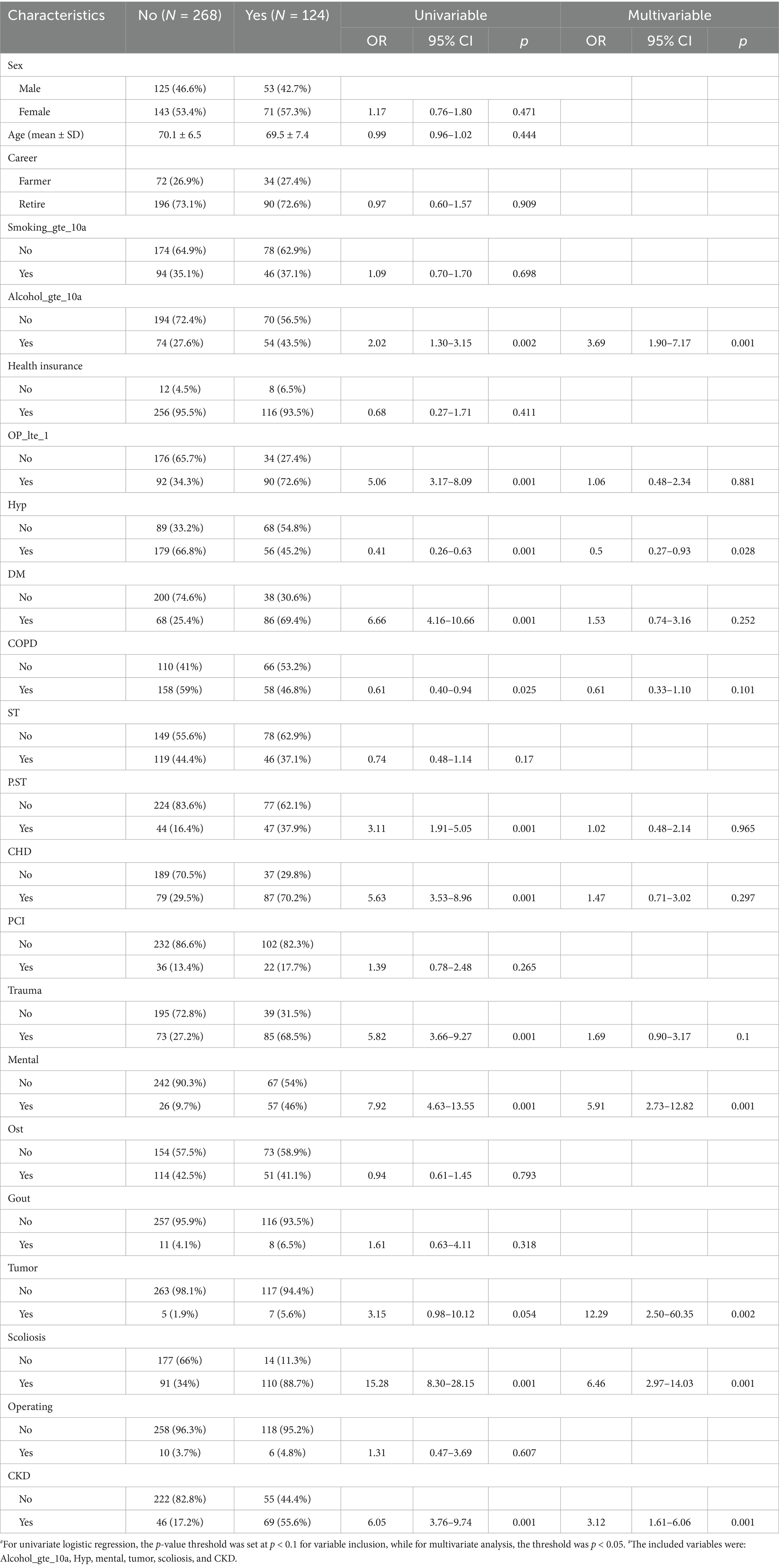 Univariable and multivariable logistic regression analyses were performed to identify factors associated with OVCF re.fra. In univariable analysis, significant predictors included alcohol use for ≥10 years (OR = 2.02, 95% CI: 1.30–3.15, p = 0.002), hypertension (OR = 0.41, 95% CI: 0.26–0.63, p < 0.001), mental disorders (OR = 7.92, 95% CI: 4.63–13.55, p < 0.001), scoliosis (OR = 15.28, 95% CI: 8.30–28.15, p < 0.001), CKD (OR = 6.05, 95% CI: 3.76–9.74, p < 0.001), and tumor history (OR = 3.15, 95% CI: 0.98–10.12, p = 0.054). After adjustment in the multivariable model, alcohol use for ≥10 years (aOR = 3.69, 95% CI: 1.90–7.17, p < 0.001), mental disorders (aOR = 5.91, 95% CI: 2.73–12.82, p < 0.001), scoliosis (aOR = 6.46, 95% CI: 2.97–14.03, p < 0.001), CKD (aOR = 3.12, 95% CI: 1.61–6.06, p < 0.001), and tumor history (aOR = 12.29, 95% CI: 2.50–60.35, p = 0.002) remained independently associated with OVCF re.fra. Hypertension retained significance but with reduced effect size (aOR = 0.50, 95% CI: 0.27–0.93, p = 0.028) (Table 2).