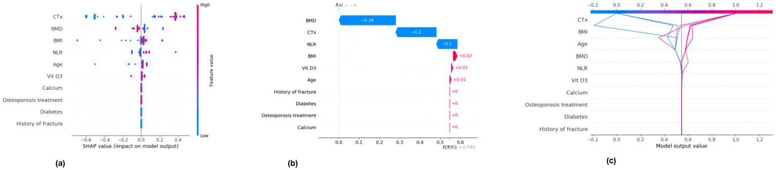 In this study, various machine learning models—including Logistic Regression, Naive Bayes, SVM, Decision Tree, AdaBoost, Gradient Boosting, and Balanced Bagging—were developed using Python 3.11.7 with the scikit-learn library. Since the retrospectively collected laboratory dataset contained only a small fraction of missing values, we employed the missForest algorithm, thereby minimizing information loss while preserving the underlying distribution structure. Model training employed 10-fold cross-validation and grid search for hyperparameter optimization: the former partitions the training data into 10 subsets, iteratively using nine for training and one for validation to reduce partition bias, while grid search systematically explores a predefined parameter space to identify the optimal parameter combination. Model performance was evaluated using metrics such as AUC, sensitivity, specificity, PPV, NPV, accuracy, F1-score, and Brier Score, ensuring a comprehensive assessment of classification ability, stability, and calibration. To control overfitting in high-variance learners, we imposed a priori constraints (for tree/boosting models: max_depth ≤3, min_samples_leaf ≥20, learning_rate ≤0.05) and used class-balanced resampling within a Balanced Bagging framework. Learning curve analyses showed that performance plateaued once the training sample exceeded approximately 200 cases; permutation tests (1,000 shuffles) yielded an AUC of approximately 0.50, indicating that the observed discrimination was not due to chance. Additionally, SHAP (SHapley Additive exPlanations) was applied to quantify each feature’s contribution to the model’s predictions, enhancing interpretability and providing insights into the decision-making process. The same individual can be re-scored at follow-up when new densitometry or laboratory results are available, allowing trajectory monitoring after treatment initiation or adjustment. A five-feature configuration (BMD T-score, CTx, NLR, age, BMI) preserved >90% of full-model discrimination, supporting deployment where selected assays are unavailable.