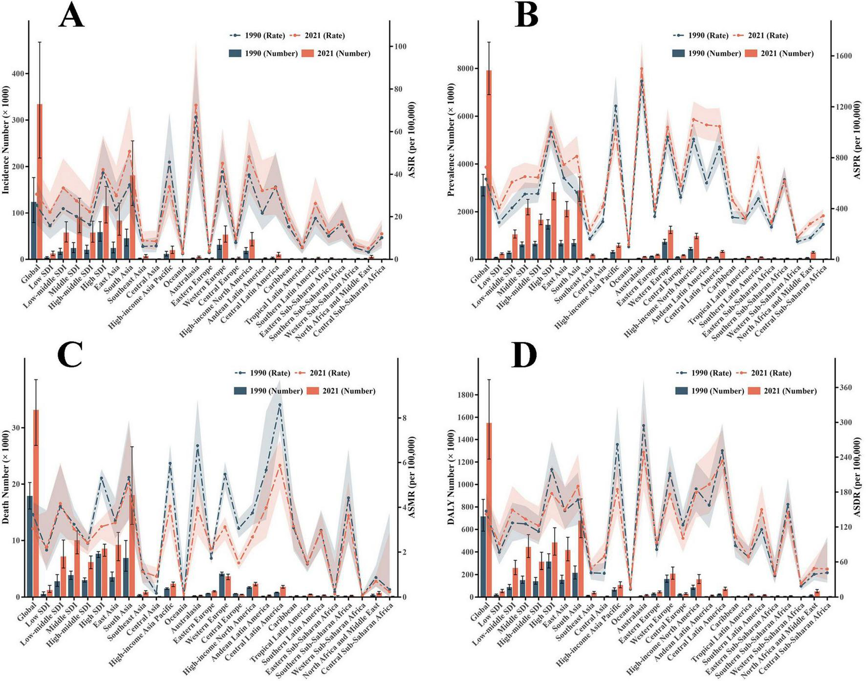 | ASR in 1990 (95% UI) | ASR in 2021 (95% UI) | EAPCs (95% CI) | ASR in 1990 (95% UI) | ASR in 2021 (95% UI) | EAPCs (95% CI) | ASR in 1990 (95% UI) | ASR in 2021 (95% UI) | EAPCs (95% CI) | ASR in 1990 (95% UI) | ASR in 2021 (95% UI) | EAPCs (95% CI) | |