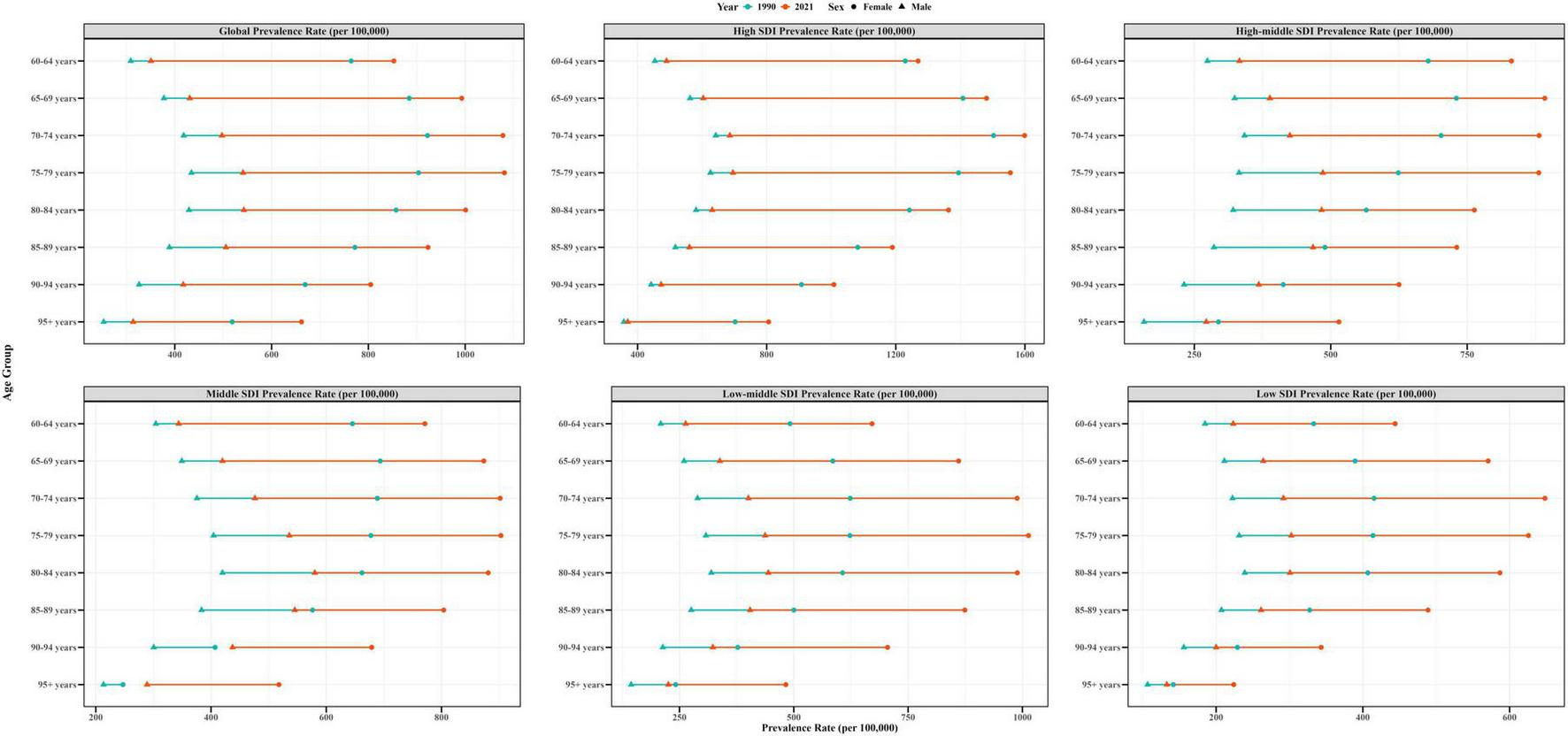 Age-standardized prevalence rates of EORA by sex, age group, and socio-demographic index; 1990 and 2021. EORA, elderly-onset rheumatoid arthritis.