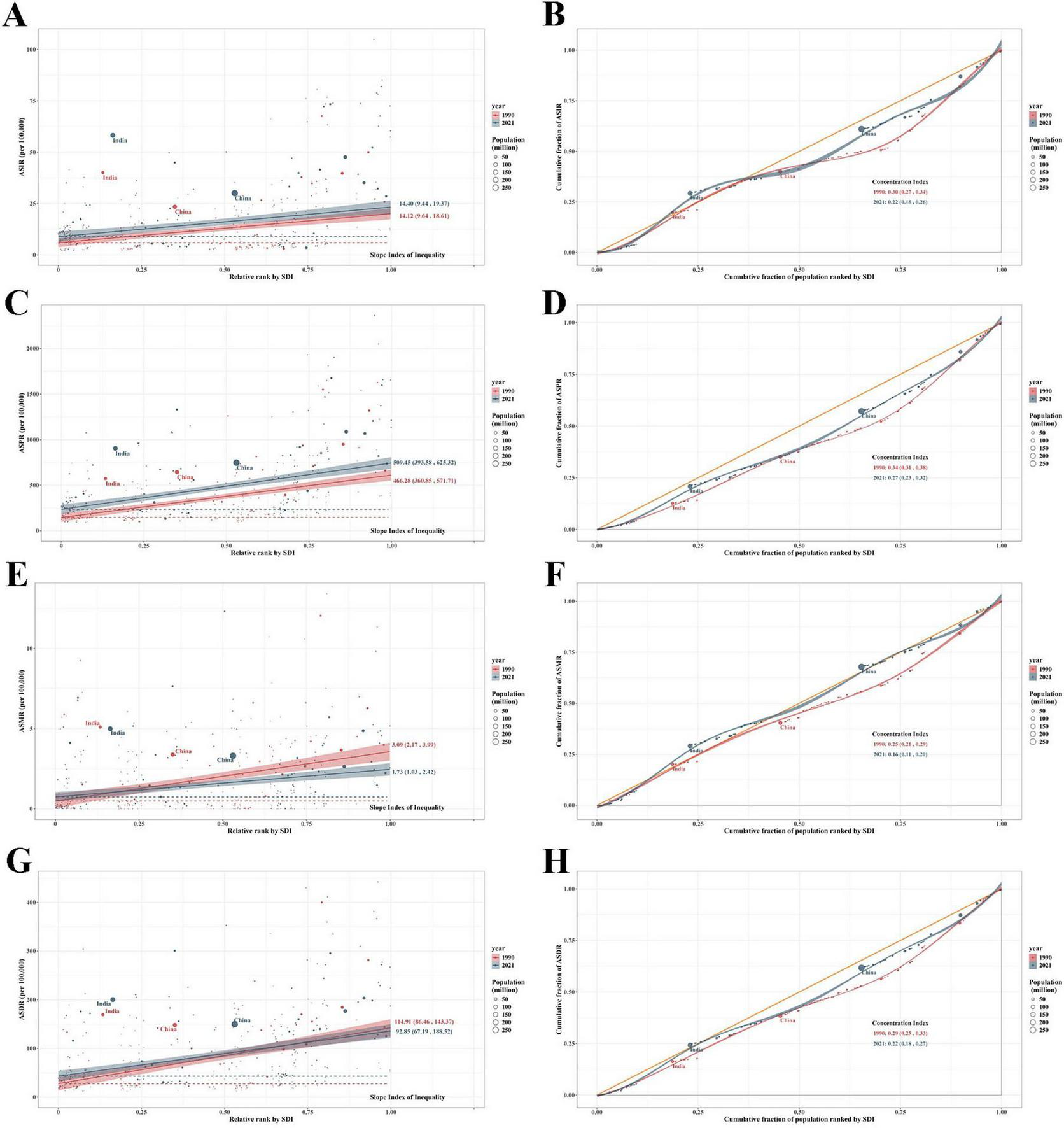 Health inequality regression curves and concentration curves for global EORA in 1990 and 2021. (A,B) Incidence; (C,D) Prevalence; (E,F) Mortality; (G,H) DALYs. DALYs, disability-adjusted life years; EORA, elderly-onset rheumatoid arthritis.