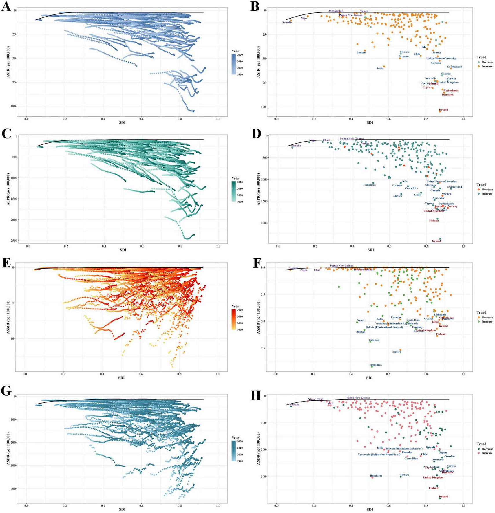 Between 1990 and 2021, a frontier analysis for EORA was conducted based on ASRs and SDI in 204 countries and territories. The results showed an upward trend for ASIR and ASPR but a downward trend for ASMR and ASDR (Figures 5A,C,E, G). Regarding the ASIR and ASPR, countries such as Australia, Switzerland, Canada, and the United States demonstrated substantial gaps relative to the frontier, indicating significant room for improvement (Supplementary Tables 6, 7). Conversely, lower SDI countries such as Somalia, Papua New Guinea, Niger, and Yemen exhibited relatively smaller gaps (Figures 5B, D), which may not reflect superior disease control but rather under-ascertainment due to limited healthcare access, diagnostic capabilities, and reporting systems. Regarding ASMR and ASDR, Honduras, India, and Costa Rica showed larger disparities from the frontier (Supplementary Tables 8, 9). Notably, high SDI countries including Ireland, Finland, and the United Kingdom, despite exhibiting declining trends in 1990–2021, still maintained considerable gaps relative to the frontier (Figures 5F, H).