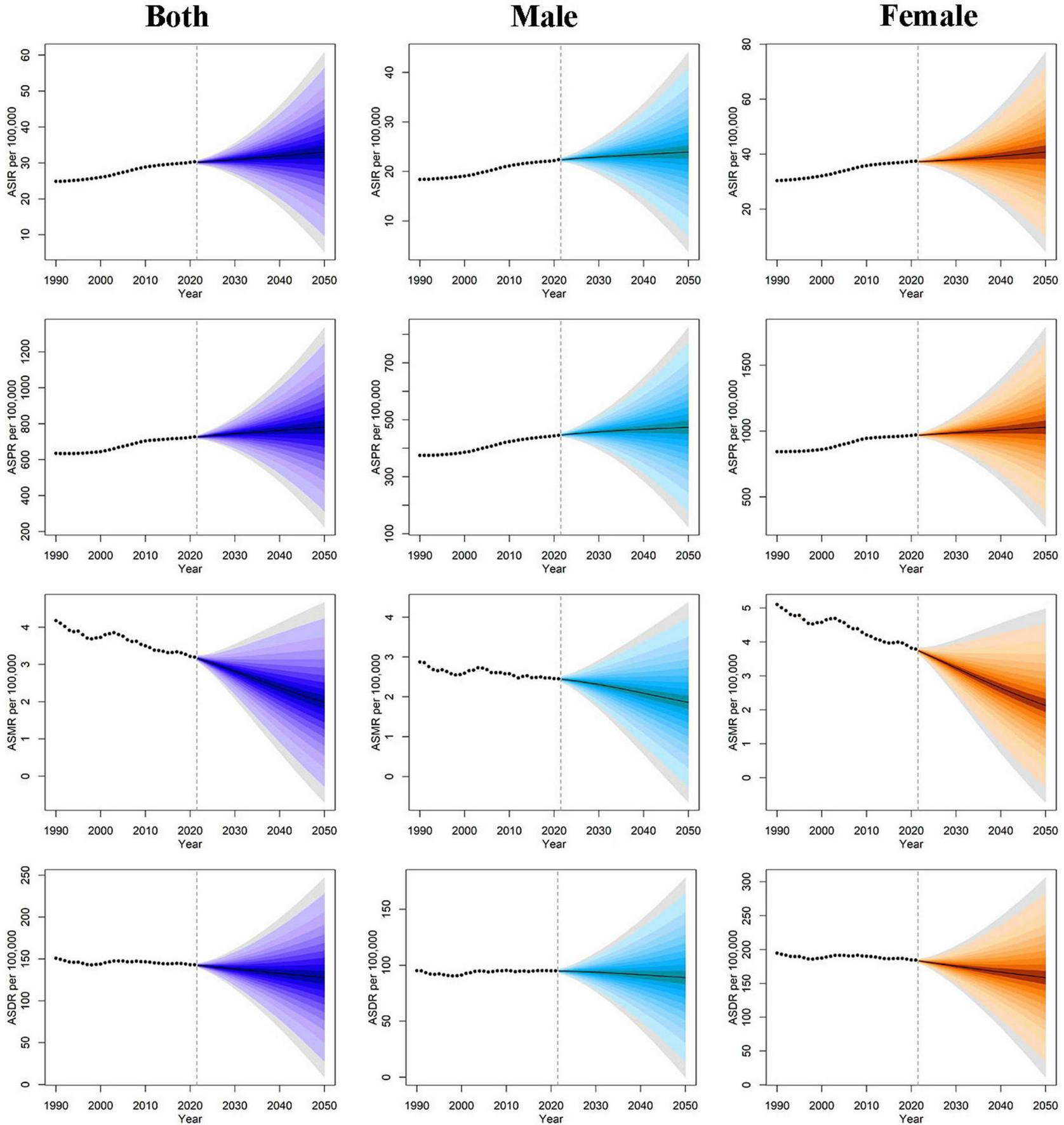 Age-standardiszed rates of EORA from 1990 to 2050 based on the BAPC model, stratified by sex. ASR, age-standardized rate; DALYs, disability-adjusted life years; EORA, elderly-onset rheumatoid arthritis; BAPC, Bayesian age-period cohort.