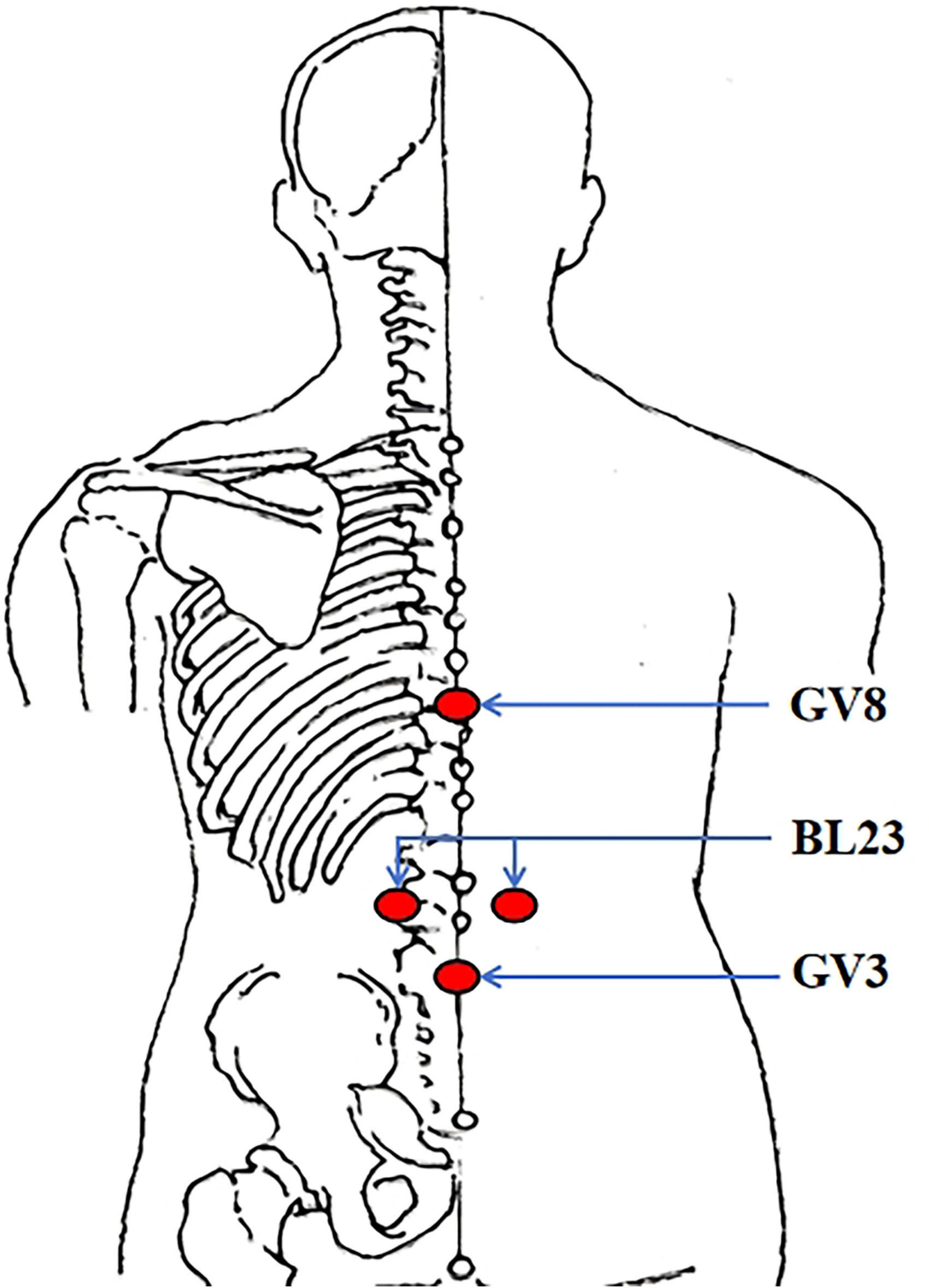 Figure 2. Location of acupoints. BL23 (Shenshu); under the spinous process of the second lumbar vertebra, 1.5 cun lateral to the posterior midline. GV3 (Yaoyangguan); on the posterior midline, under the spinous process of the fourth lumbar vertebra. GV8 (Jinsuo); on the posterior midline, under the spinous process of the ninth thoracic vertebra.