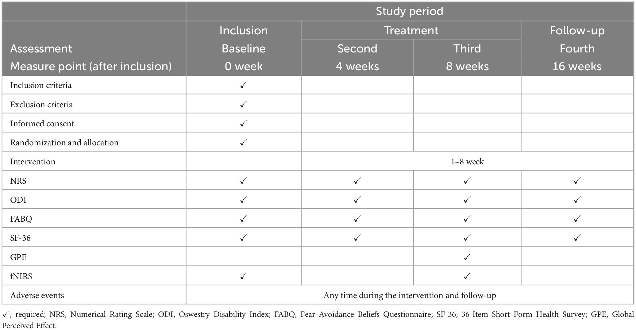 Pain is the predominant symptom of CNLBP. Consequently, the NRS was adopted to evaluate whether the intervention could alleviate patients’ pain intensity. For individuals with CNLBP, psychological factors serve as critical predictors of long-term disability, with fear of pain often contributing more to functional limitations than the pain itself (42, 43). Fear-avoidance beliefs may drive patients to adopt protective behaviors, thereby precipitating and perpetuating disability while hindering the restoration of normal functional capacity (44, 45). Therefore, the FABQ and the ODI were employed to assess whether the intervention could ameliorate pain-related fear and associated physical dysfunction. Given that persistent pain severely compromises patients’ physical and mental wellbeing, the SF-36 was additionally utilized to comprehensively evaluate whether the intervention could enhance patients’ quality of daily life.