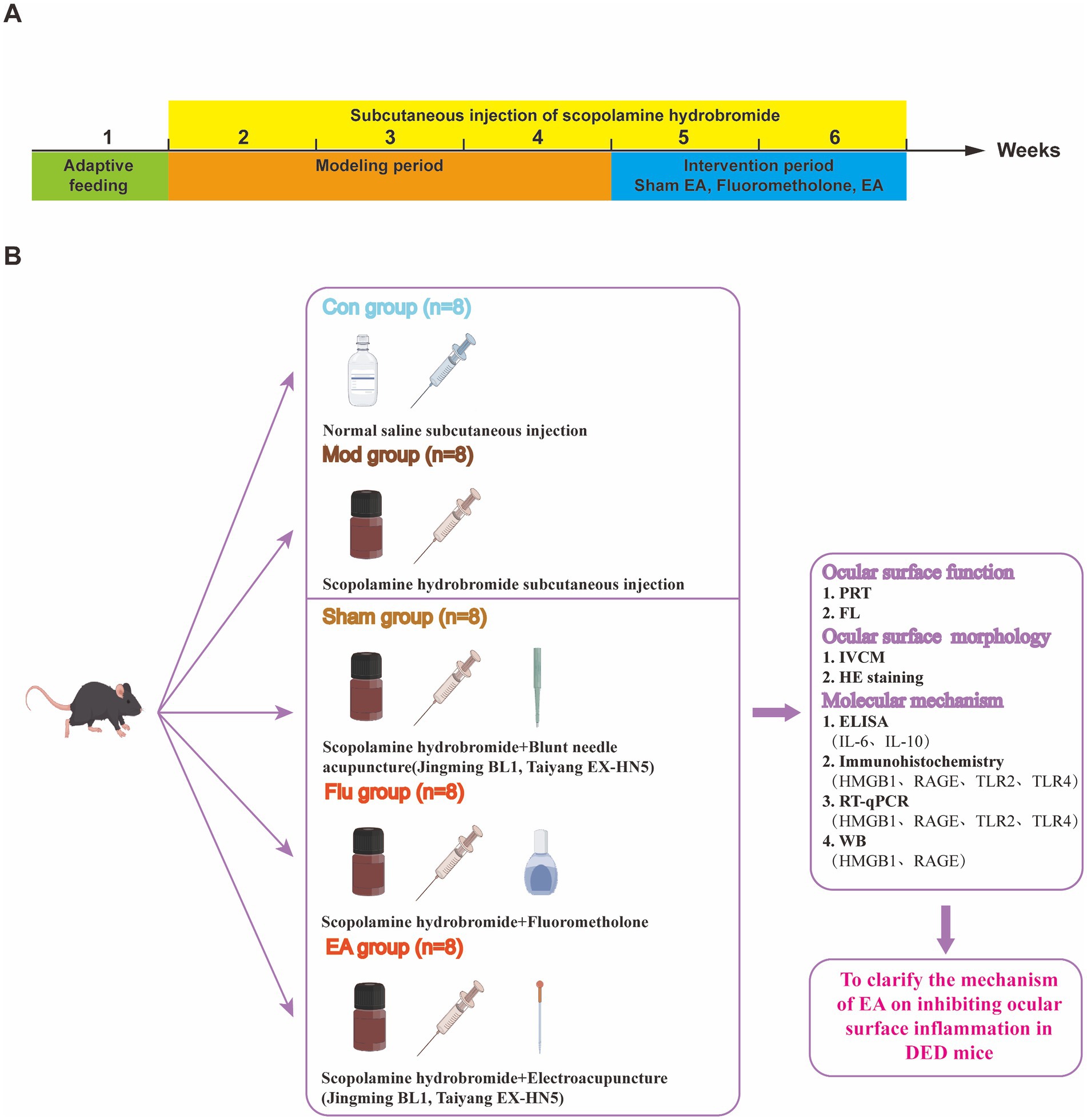 Instruments and reagents used in this study: LYL-S handheld slit lamp microscope inspection instrument (Shangrao Rixin Optical Instrument Components Co., Ltd., China); acupuncture needle (φ0.18 × 13 mm, Huatuo brand, Suzhou Medical Supplies Factory Co., Ltd., China); SDZ-II electroacupuncture therapy device (Huatuo brand, Suzhou Medical Supplies Factory Co., Ltd., China); Confocal Microscopy (HRT III RCM, Heidelberg Company, Germany); RM2016 pathological slicer (LEICA, Germany); optical microscope (Nikon, Japan); fluorometholone eye drops (0.1%, Shentian Pharma, China); scopolamine hydrobromide (Chengdu Pufeide Biotech Co., Ltd., China); tear detection phenol red thread (Tianjin Jingming New Technology Development Co., Ltd., China); fluorescein sodium ophthalmic strips (Tianjin Yino Xinkang Medical Equipment Technology Co., Ltd., China); IL-6 ELISA Kit (BMS603-2HS, Invitrogen, America); IL-10 ELISA Kit (CSB-E04594m-IS, CUSABIO, China); SuperMix for qPCR (gDNA digester plus) (Yisheng Biotechnology Co., Ltd., China); qPCR SYBR Green Master Mix (Yisheng Biotechnology Co., Ltd., China); HRP-conjugated goat anti-rabbit IgG (GB23303, Servicebio, China); HMGB1 (GB11103-100, Servicebio, China); RAGE (PA1-075, Invitrogen, America); TLR2 (PA1-41045, Invitrogen, America); TLR4 (MA5-16216, Invitrogen, America).
