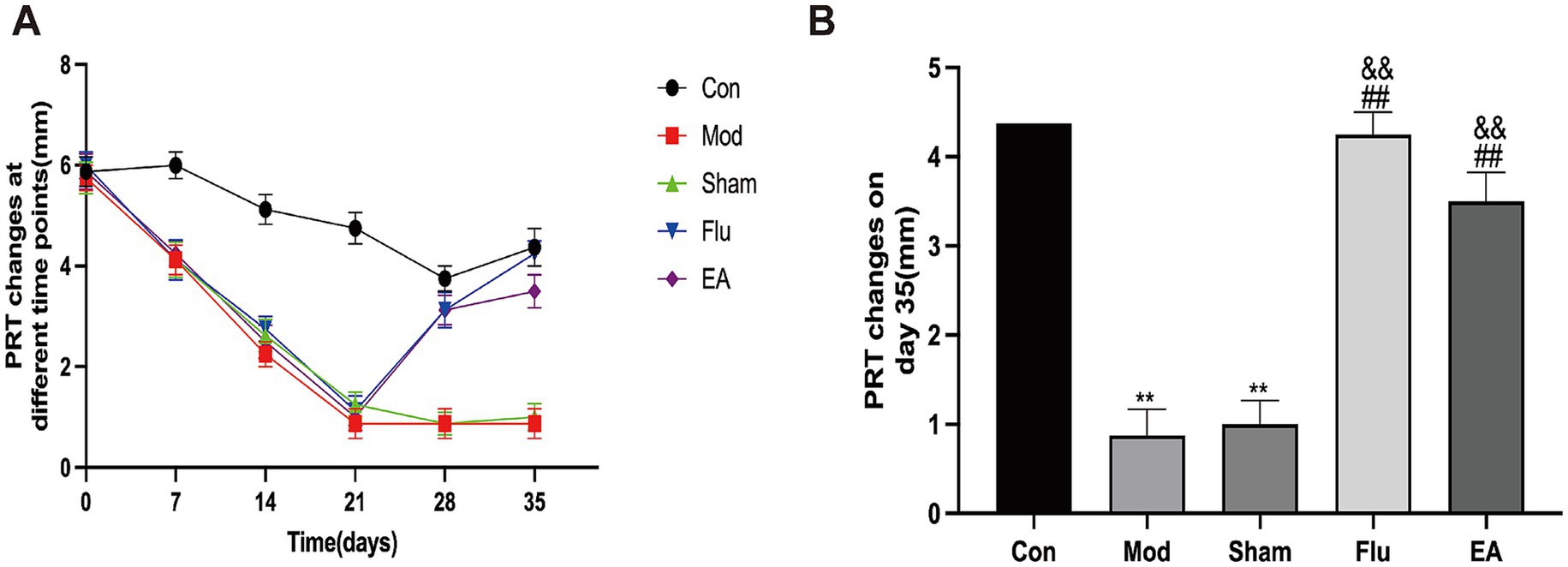 Figure 2. Effect of EA on tear volume in scopolamine-hydrobromide-induced DED mice. (A) Tear volume changes at different times (n = 8); (B) Tear volume of each of the groups on the 35th day (n = 8). Compared with the Con group, ∗∗p < 0.01; compared with the Mod group, ##p < 0.01; compared with the Sham group, &&p < 0.01.