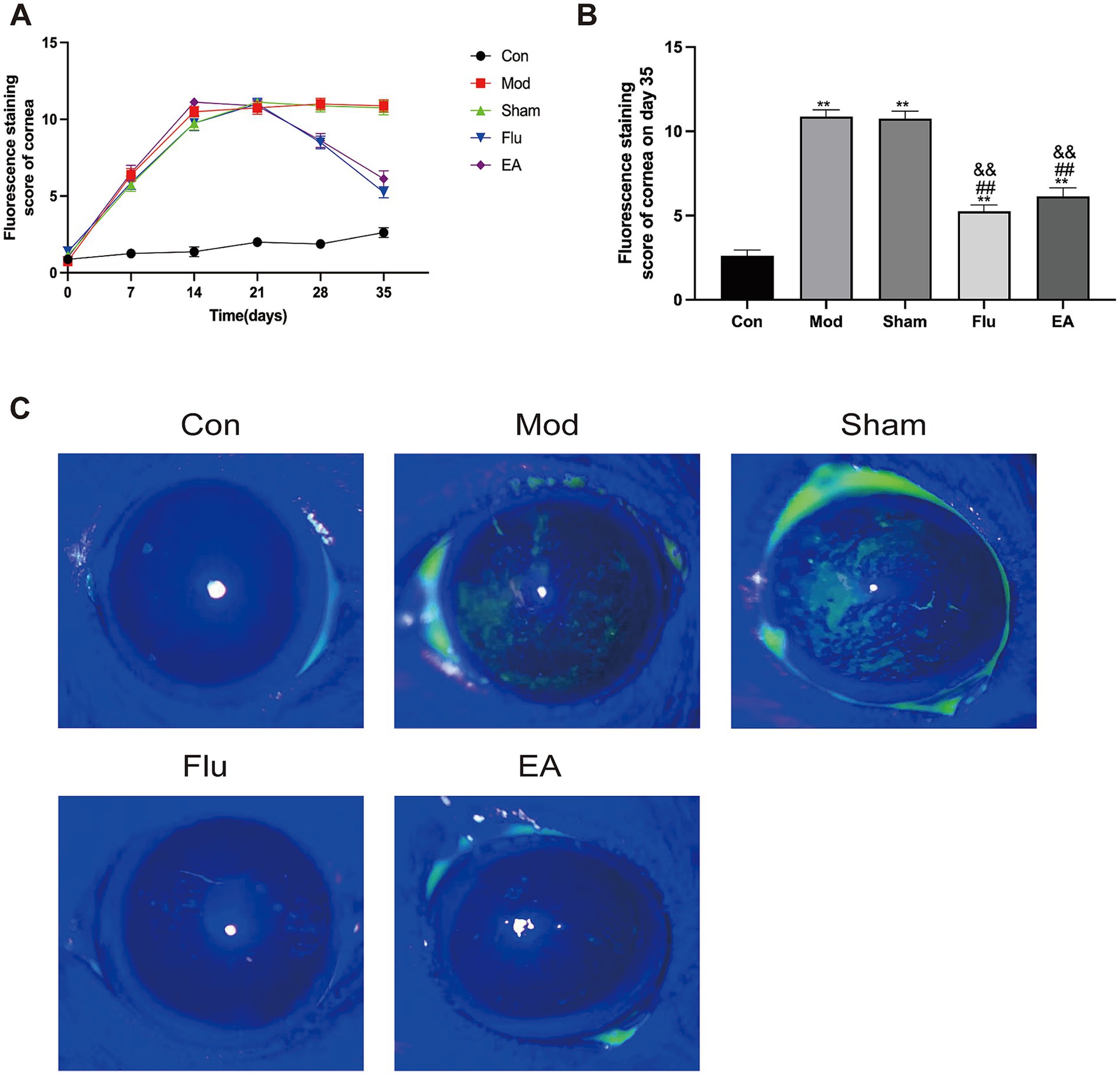 Figure 3. Effect of EA on corneal epithelial damage in scopolamine-hydrobromide-induced DED mice. (A) FL score changes at different time points (n = 8). (B) FL score of each group on the 35th day (n = 8). (C) Fluorescent staining pictures of the cornea. Compared with the Con group, ∗∗p < 0.01; compared with the Mod group, ##p < 0.01; compared with the Sham group, &&p < 0.01.