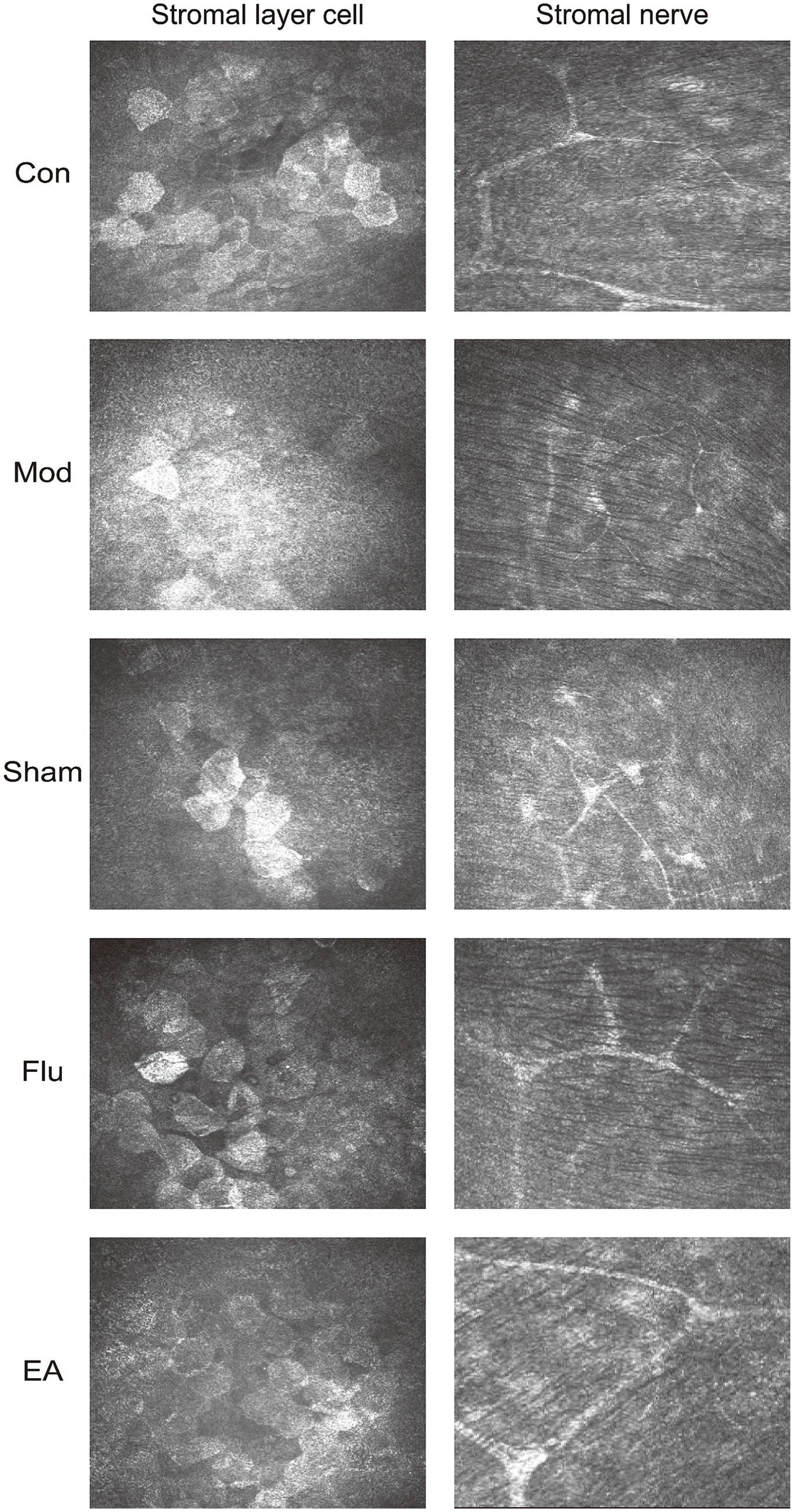 The corneal epithelium was observed under the corneal confocal microscopy, which is difficult to see using C57BL/6J mouse as an animal model (Figure 4). The Con group showed normal levels of stromal cells and nerve fiber distribution. The Mod group and the Sham group showed irregularly sized activated stromal cells, and intermittently thinner nerve fibers with a high degree of tortuosity. Compared with these two groups, the EA and Flu groups showed that the morphology and size of stromal cells gradually returned to normal except mild activation of partial cells, and there were no obvious abnormalities in the distribution of nerve fibers which indicate a significant reduction in corneal stromal inflammation.