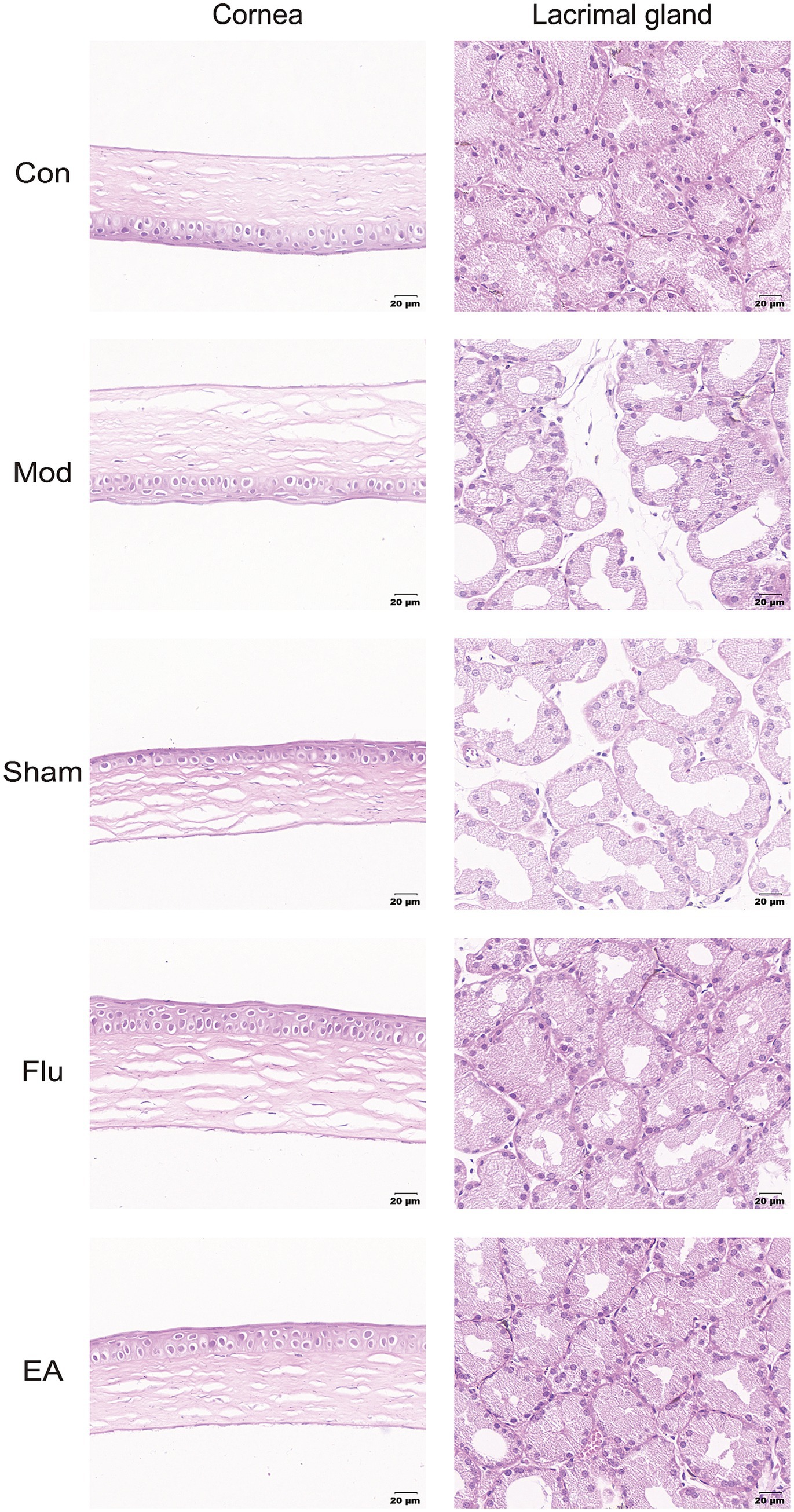 The results of HE staining showed that the corneal tissue surface of the Mod and Sham groups were found to have reduced corneal cell layers, detached surface epithelial cells, disordered arrangement and swelling of collagen fibers in the matrix layer, and swelling. Additionally, obvious atrophy of lacrimal gland epithelial cells, expanded glandular cavity, and focal lymphocyte infiltration were also seen in the Mod and Sham groups. In comparison to these two groups, the EA and Flu groups had basically normal numbers of corneal epithelium layers, no apparent epithelium cell sloughing, well-arranged collagen fibers in the stromal layer, and slight swelling. In addition, the epithelial cells of the lacrimal gland tissue in the EA and Flu groups were partially atrophied, and the lumen of the gland was partially dilated, with a small amount of lymphocyte infiltration (Figure 5).