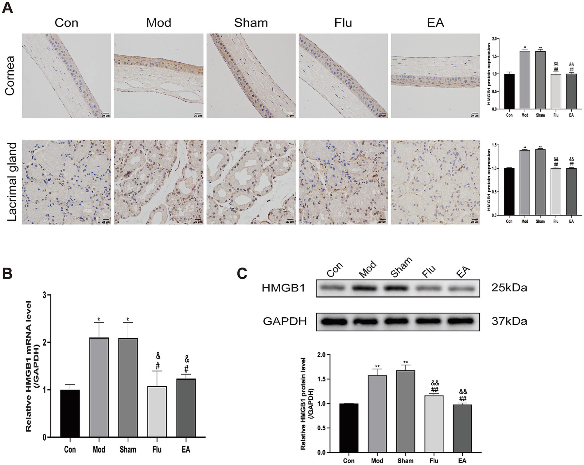 Figure 6. Effect of EA on expression of HMGB1 in corneal and lacrimal gland tissues of scopolamine-hydrobromide-induced DED mice. (A) Immunohistochemical detection of HMGB1 expression in corneal and lacrimal gland tissues of DED mice (n = 3). (B) RT-qPCR detection of HMGB1 mRNA expression in lacrimal gland tissues of DED mice (n = 3). (C) WB detection of HMGB1 protein expression in lacrimal gland tissues of DED mice (n = 3). Compared with the Con group, *p < 0.05, ∗∗p < 0.01; compared with the Mod group, #p < 0.05, ##p < 0.01; compared with the Sham group, &p < 0.05, &&p < 0.01.