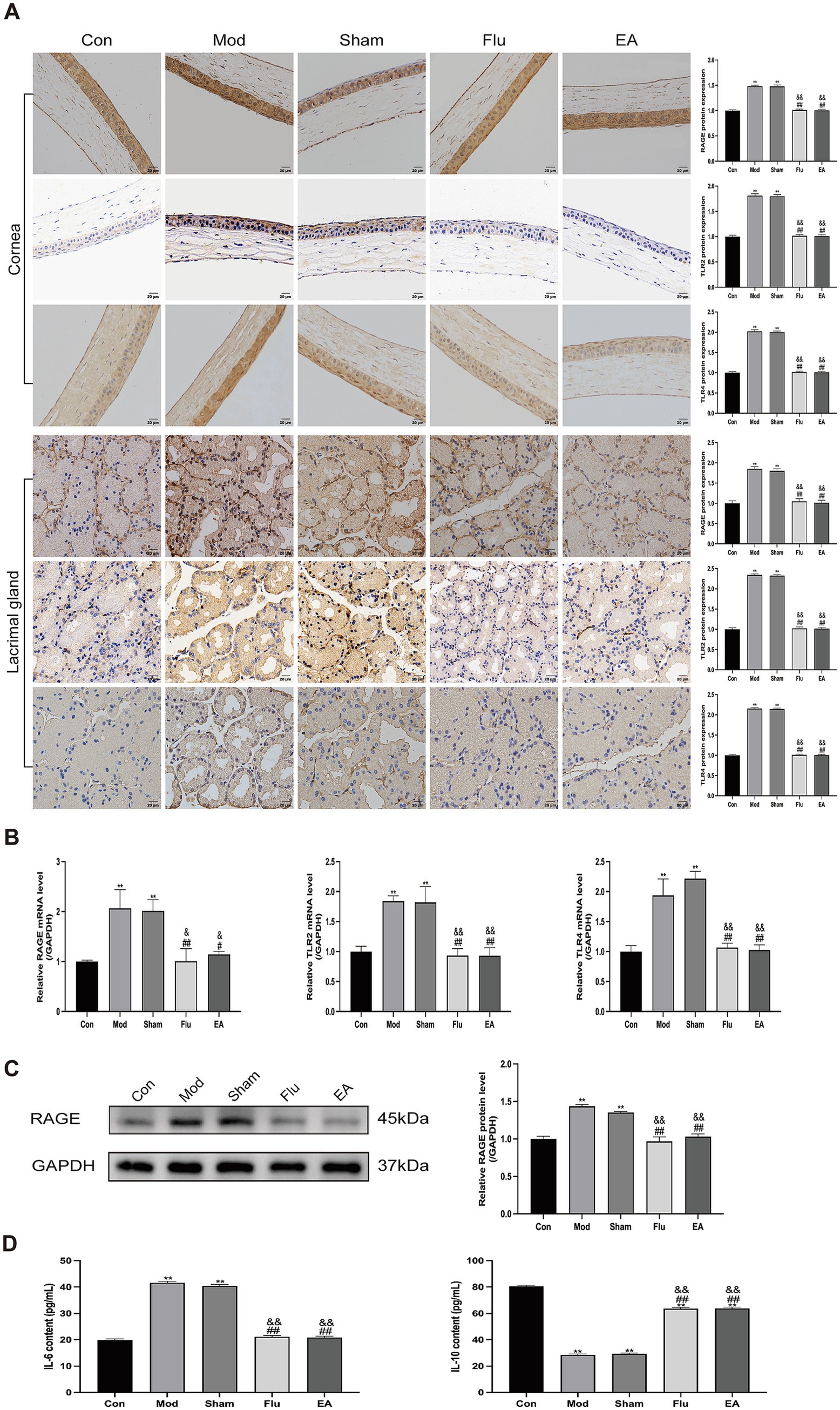 Figure 7. Effect of EA on expression of RAGE, TLR2, and TLR4 in corneal and lacrimal gland tissues of scopolamine-hydrobromide-induced DED mice. (A) Immunohistochemical detection of RAGE, TLR2, and TLR4 expression in corneal and lacrimal gland tissues of DED mice (n = 3). (B) RT-qPCR detection of RAGE, TLR2, and TLR4 mRNA expression in lacrimal gland tissues of DED mice (n = 3). (C) WB detection of RAGE protein expression in lacrimal gland tissues of DED mice (n = 3). (D) ELISA detection of IL-6 and IL-10 levels in serum of DED mice (n = 6). Compared with the Con group, ∗∗p < 0.01; compared with the Mod group, #p < 0.05, ##p < 0.01; compared with the Sham group, &p < 0.05, &&p < 0.01.