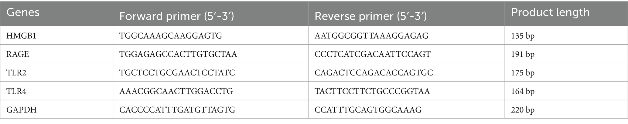 Trizol method was used to extract total RNA from mice lacrimal glands, which was then converted to cDNA with a reverse transcription kit. RT-PCR was performed in a 10 μL reaction system containing cDNA SYBR Green Master Mix and specific primers according to the manufacturer’s instructions, with the following specific reaction process: pre-denaturation at 95 °C for 5 min, denaturation at 95 °C for 10 s, and annealing at 60 °C for 30 s in 40 consecutive cycles. The primers were designed for GAPDH, HMGB1, RAGE, TLR2 and TLR4, with GAPDH used as the internal reference. The sequencing information for each primer pair is shown in Table 1. Finally, the 2−ΔΔCt method was used to determine the relative expression level of the mRNAs.