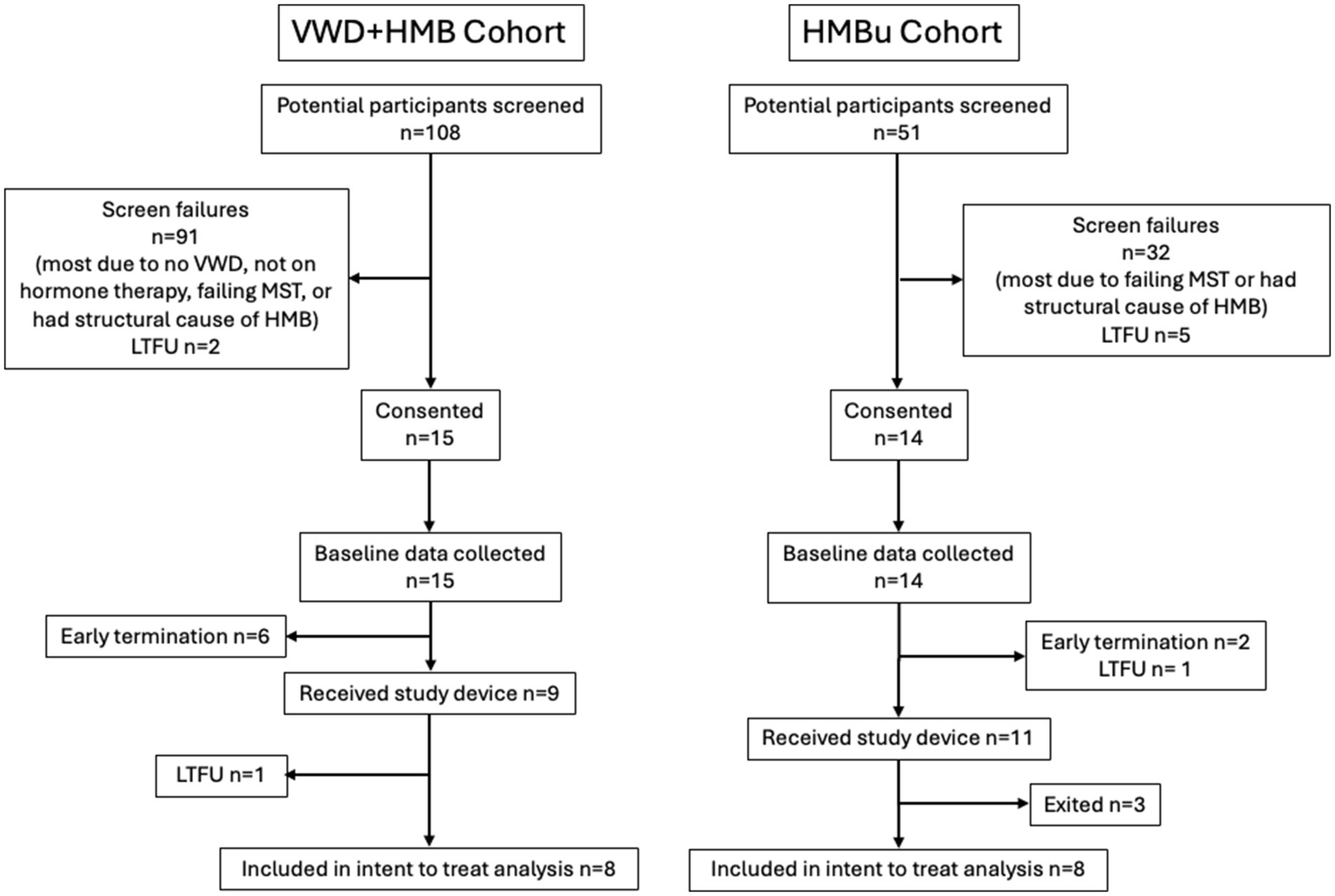 Figure 3. CONSORT flow diagram. Early terminations occurred due to inconsistent data reporting (n = 4), PBAC < 150 (n = 3), or menstruation 15 days or longer (n = 1). Participant exits after receiving study device occurred because they were deemed non-compliant with protocol (n = 2) or were unable to position the device properly (n = 1). VWD, von Willebrand disease; HMB, heavy menstrual bleeding; UHMB, HMB of unknown cause; MST, menorrhagia screening tool; LTFU, lost to follow-up.