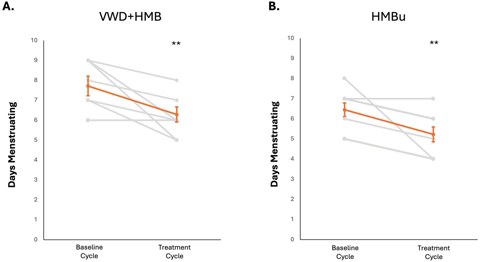 Figure 5. Effects of tAN on duration of menstruation. In all panels, responses of individual participants are shown in grey, mean and standard error are shown in orange. (A) tAN is associated with a 19.7% reduction in duration of menstruation in HMB+VWD participants (n = 8; **p < 0.01). (B) tAN is associated with a 19.6% reduction in duration of menstruation in HMBu participants (n = 8; **p < 0.01).
