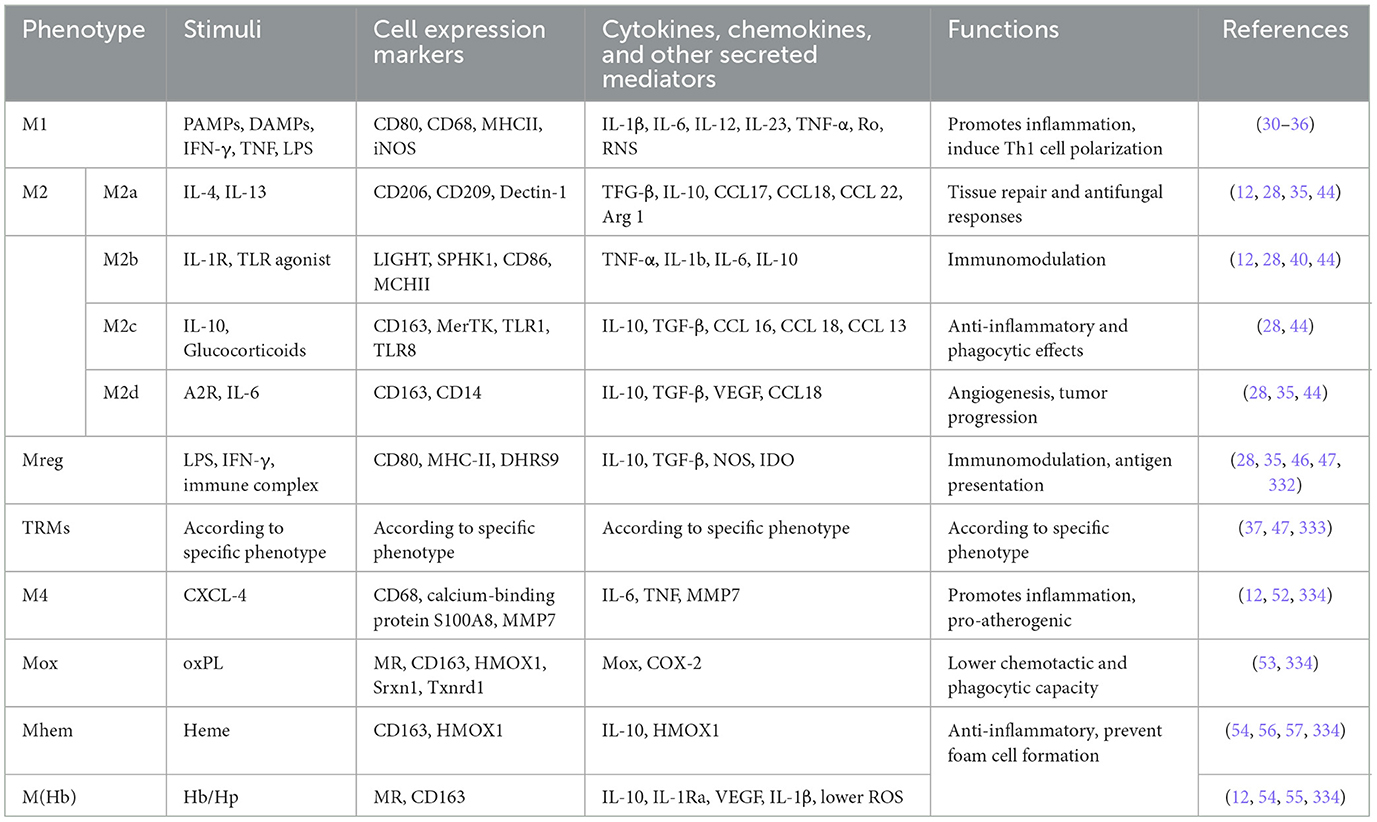 Monocyte-derived macrophages differentiate into different phenotypes on the basis of various environmental stimuli, with the most classic classification being M1 and M2 macrophages (28). In addition to the classic classification, Mreg macrophages are another newly identified type (29) (Table 1).