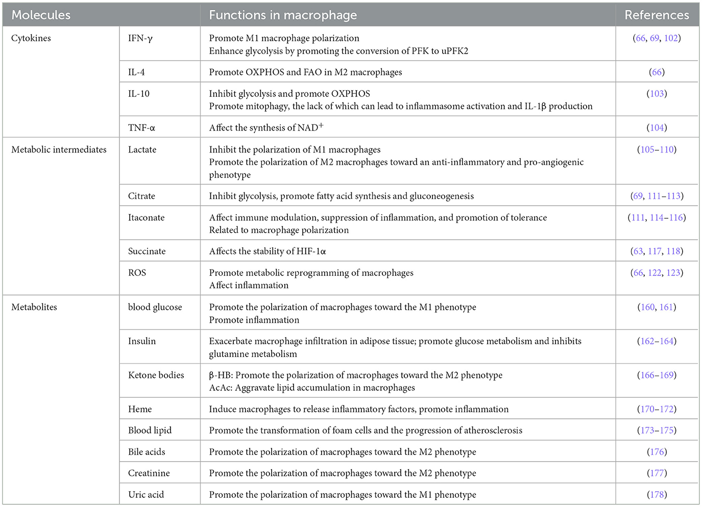 Some cytokines, metabolic intermediates, and metabolites also have interactive effects on the metabolism of macrophages. They may originate from the macrophages themselves, whereas others may originate from the circulation or other cells (Table 2).