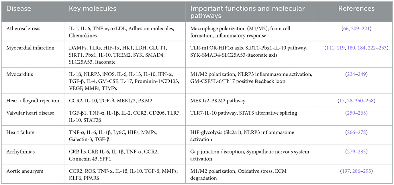 Cardiovascular diseases remain a leading cause of morbidity and mortality worldwide, particularly in developed countries (1). Accumulating evidence indicates that immune cells-including macrophages, neutrophils, T Lymphocytes (T cells), and B Lymphocytes (B cells)-play critical roles in both the injury and repair phases of inflammatory heart diseases (2). Among these, macrophages represent the predominant immune cell population in the heart and are indispensable in shaping cardiac inflammation, remodeling, and regeneration (3–6). Notably, increasing attention has been directed toward the metabolic reprogramming of macrophages and its impact on cardiovascular pathophysiology (7–9). Macrophages are ubiquitously distributed throughout the body and serve as key mediators of innate immunity. Through phagocytosis, antigen presentation, and cytokine production, they orchestrate both proinflammatory and anti-inflammatory responses, while also facilitating tissue repair and homeostasis (10). Traditionally, macrophages have been broadly classified into two functional subsets: classically activated (M1) and alternatively activated (M2) macrophages (11). However, advances in immunology and transcriptomics have revealed a much more nuanced spectrum of macrophage phenotypes. M2 macrophages can be further subdivided into M2a, M2b, M2c, and M2d subtypes, each with distinct activation stimuli and functional roles. In addition, emerging subtypes such as regulatory macrophages (Mreg), M4, Mox, and Mhem have been identified, underscoring the complexity and plasticity of the macrophage population (12). Cellular metabolism is fundamental to maintaining survival, supporting biosynthetic demands, and driving immune cell function. In macrophages, metabolic pathways not only fulfill energy requirements but also shape immune phenotypes and functional responses. Recent studies have shown that macrophages undergo dynamic metabolic shifts in response to microenvironmental cues, and these shifts critically influence their role in disease progression and resolution (13).