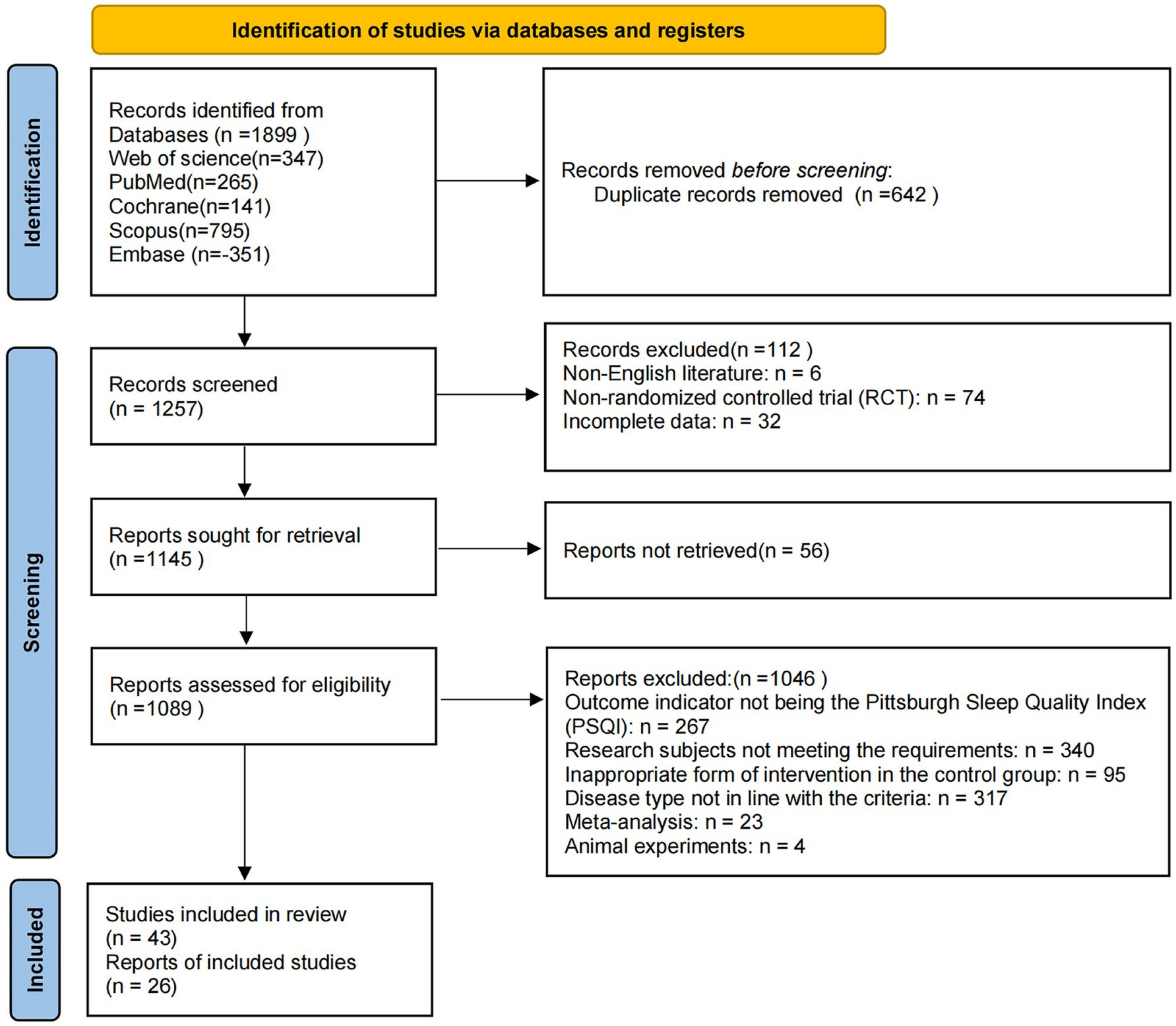 A systematic search of five databases (PubMed, Web of Science, Cochrane Library, Scopus, and Embase) yielded a total of 1,899 relevant records. After removing 642 duplicates, 1,257 studies remained for title and abstract screening. During this stage, 112 articles were excluded, including 6 non-English publications, 74 non-randomized controlled trials, and 32 with incomplete data. A total of 1,145 articles were retrieved for full-text review, of which 56 could not be obtained. Among the 1,089 reports assessed for eligibility, 1,046 were excluded for the following reasons: outcome indicators not involving the Pittsburgh Sleep Quality Index (PSQI; n = 267), study participants not meeting inclusion criteria (n = 340), inappropriate form of intervention in the control group (n = 95), disease type not in line with inclusion criteria (n = 317), meta-analysis articles (n = 23), and animal experiments (n = 4).