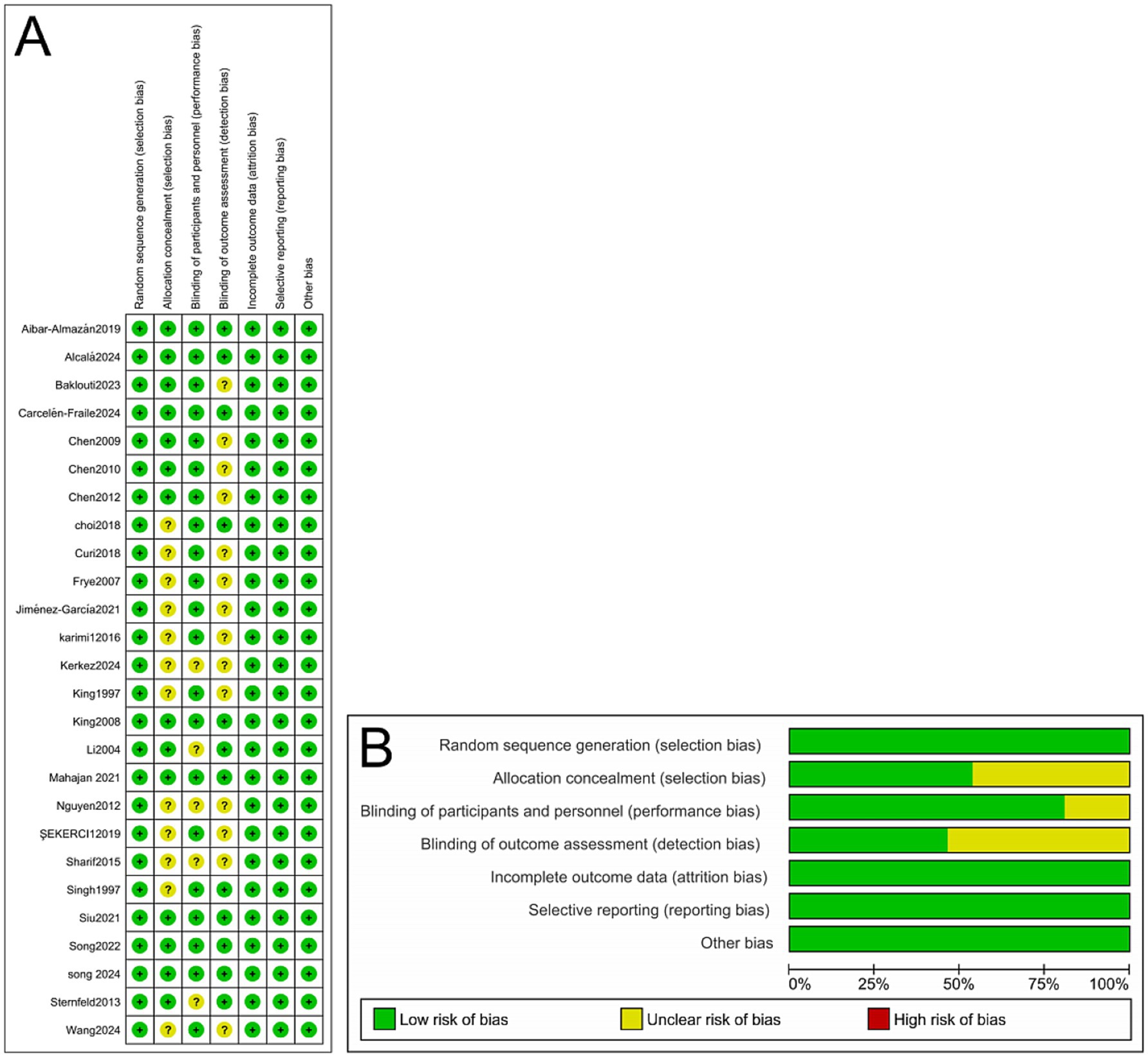 Figure 2. (A) Methodological quality assessment of 26 included RCTs. (B) Risk-of-bias summary and risk-of-bias graph for 26 RCTs.