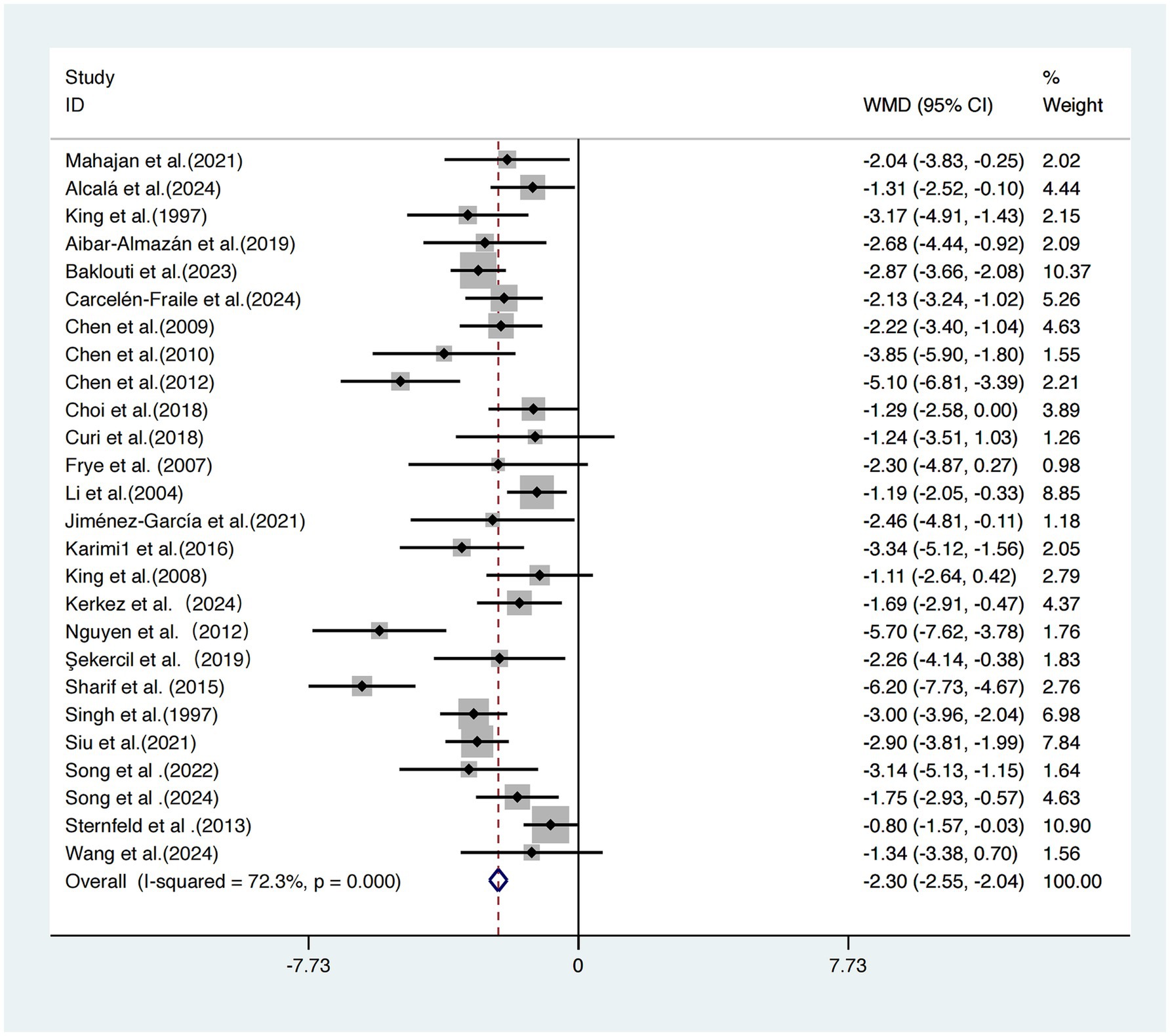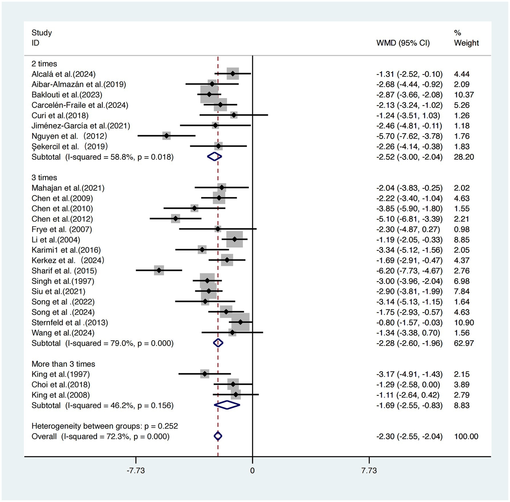 The group exercising twice per week showed the greatest improvement [WMD = −2.52, 95% CI (−3.00, −2.04)]. The group exercising three times per week had a slightly smaller effect size [WMD = −2.28, 95% CI (−2.60, −1.96)]. The group exercising more than three times per week demonstrated the weakest effect [WMD = −1.69, 95% CI (−2.55, −0.83)].