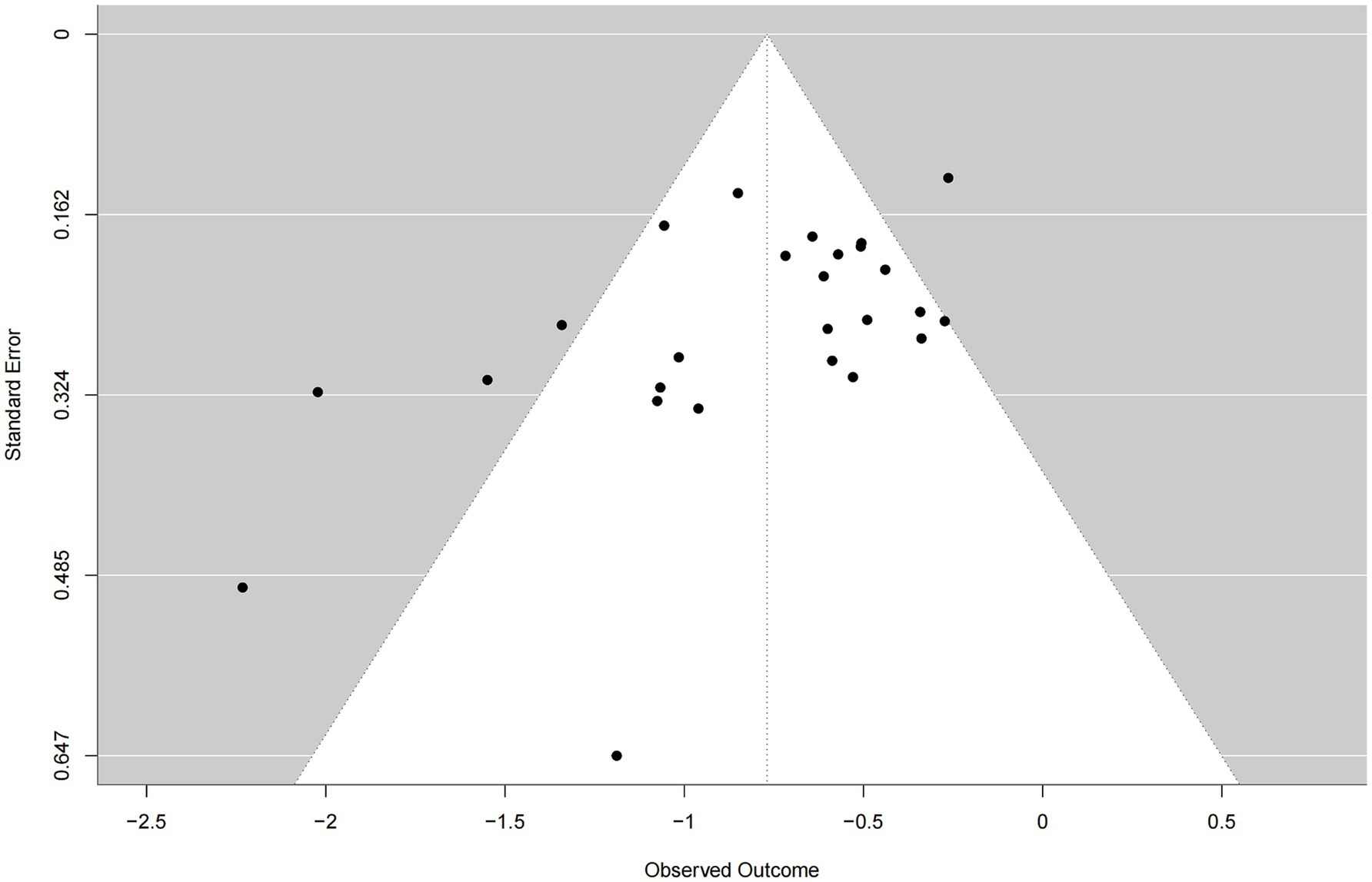 The funnel plot demonstrated an approximately symmetrical distribution of studies around the pooled effect estimate and showed convergence from the bottom to the top, suggesting no substantial evidence of publication bias in this meta-analysis (Figure 4).