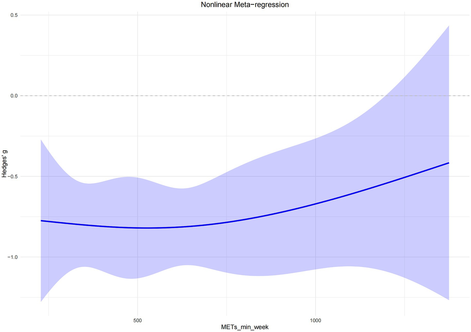 The nonlinear dose–response model revealed an inverted U-shaped relationship, with the maximal intervention effect occurring at approximately 527 MET-min/week. Beyond this threshold, the benefit plateaued, indicating that moderate exercise doses are sufficient to produce substantial improvements in sleep quality.