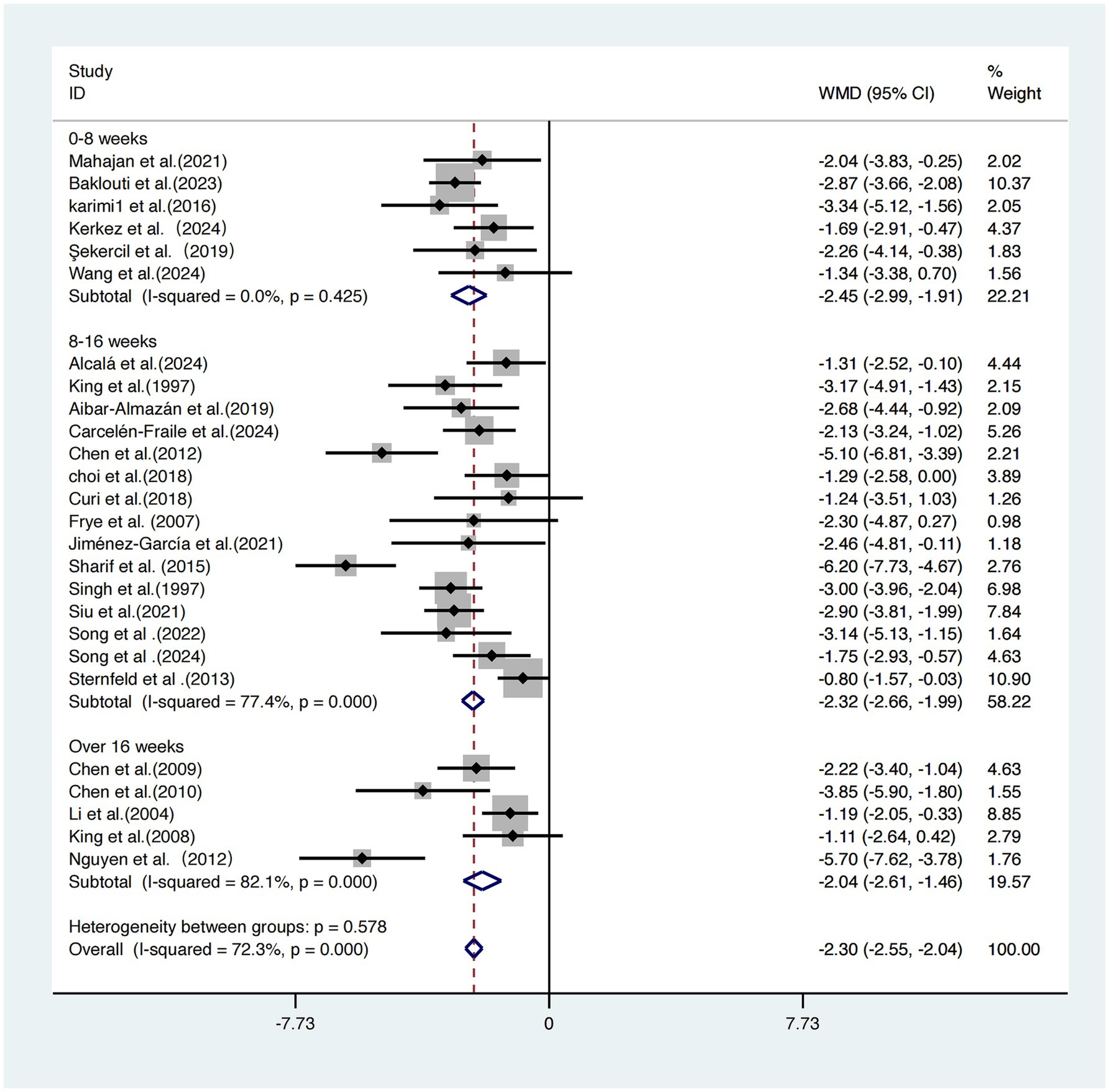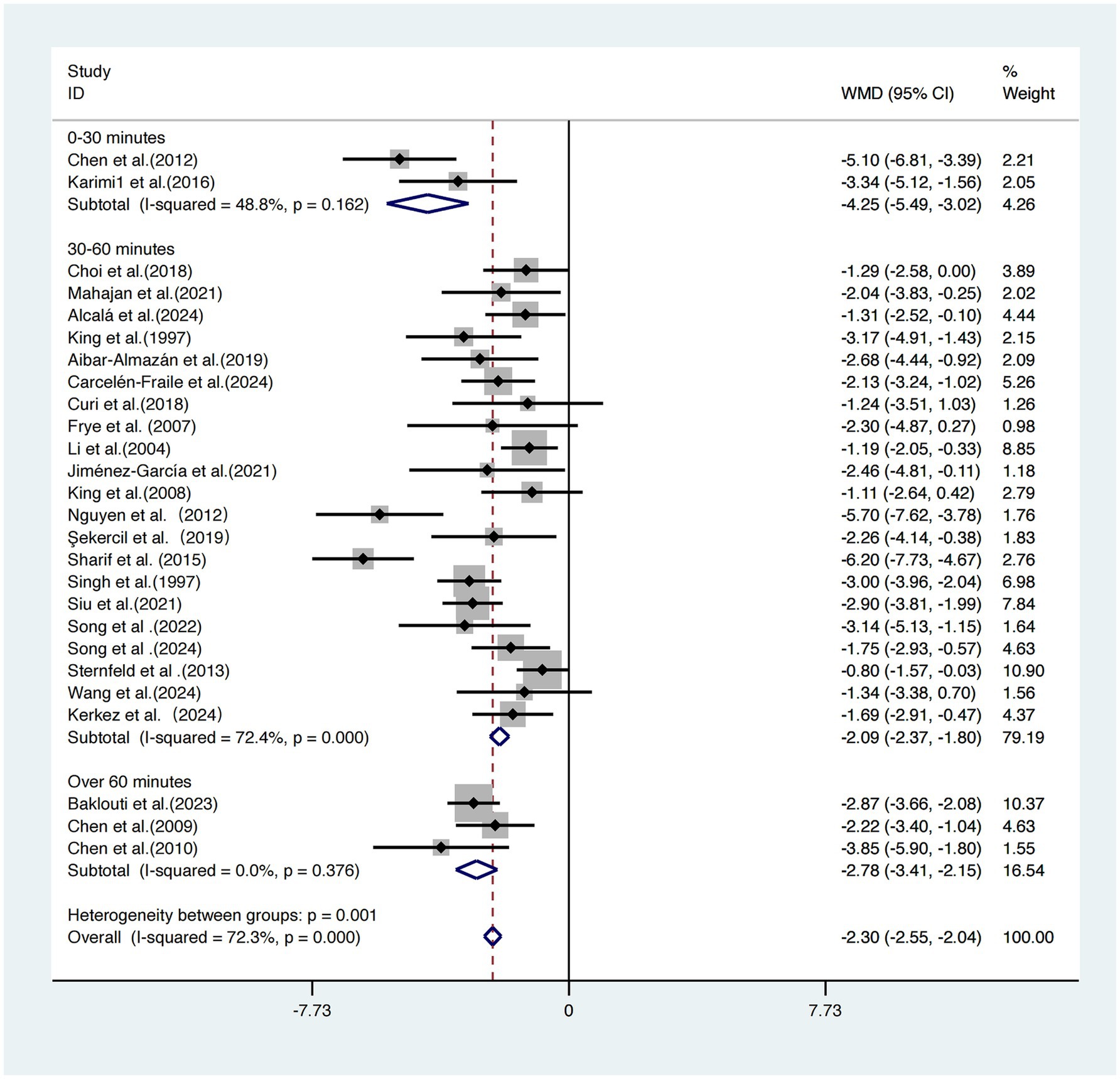 The 30–60-min group showed a WMD of −2.09 (95% CI: −2.37, −1.80), but with high heterogeneity (I2 = 72.4%, p < 0.001), suggesting greater uncertainty in the results.