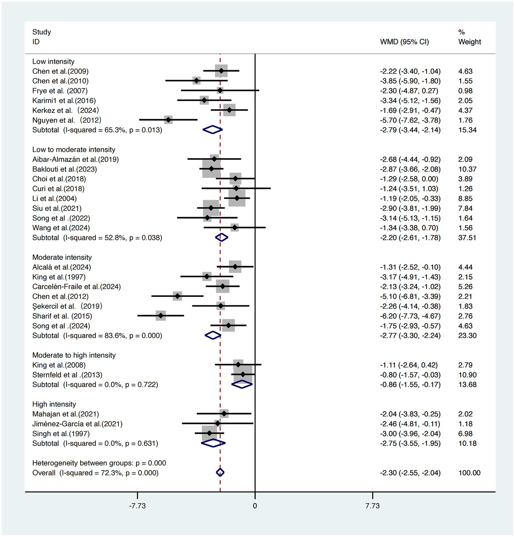 The subgroup with low-intensity interventions demonstrated the greatest effect size [WMD = −2.79, 95% CI (−3.44, −2.14)] with moderate heterogeneity (I2 = 65.3%). The moderate-intensity group yielded a similar effect size [WMD = −2.77, 95% CI (−3.30, −2.24)] but showed high heterogeneity (I2 = 83.6%). The low-to-moderate intensity group reported a WMD of −2.20 (95% CI: −2.61, −1.78) with moderate heterogeneity (I2 = 52.8%). The high-intensity group showed a WMD of −2.75 (95% CI: −3.55, −1.95) with no observed heterogeneity (I2 = 0.0%).